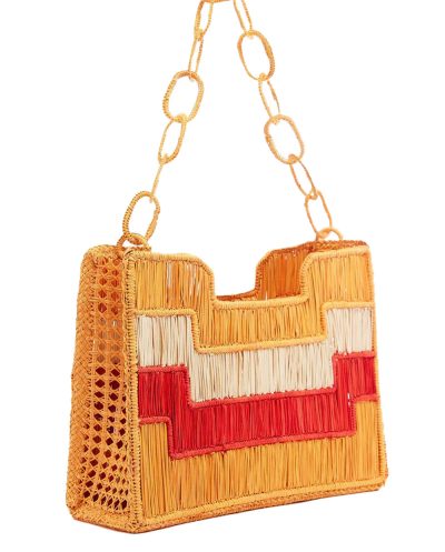Verandah features electric blue and ivory-white thread colours woven through its base of natural grass fibres to create a check pattern, with dusty-rose-pink fabric trimming.