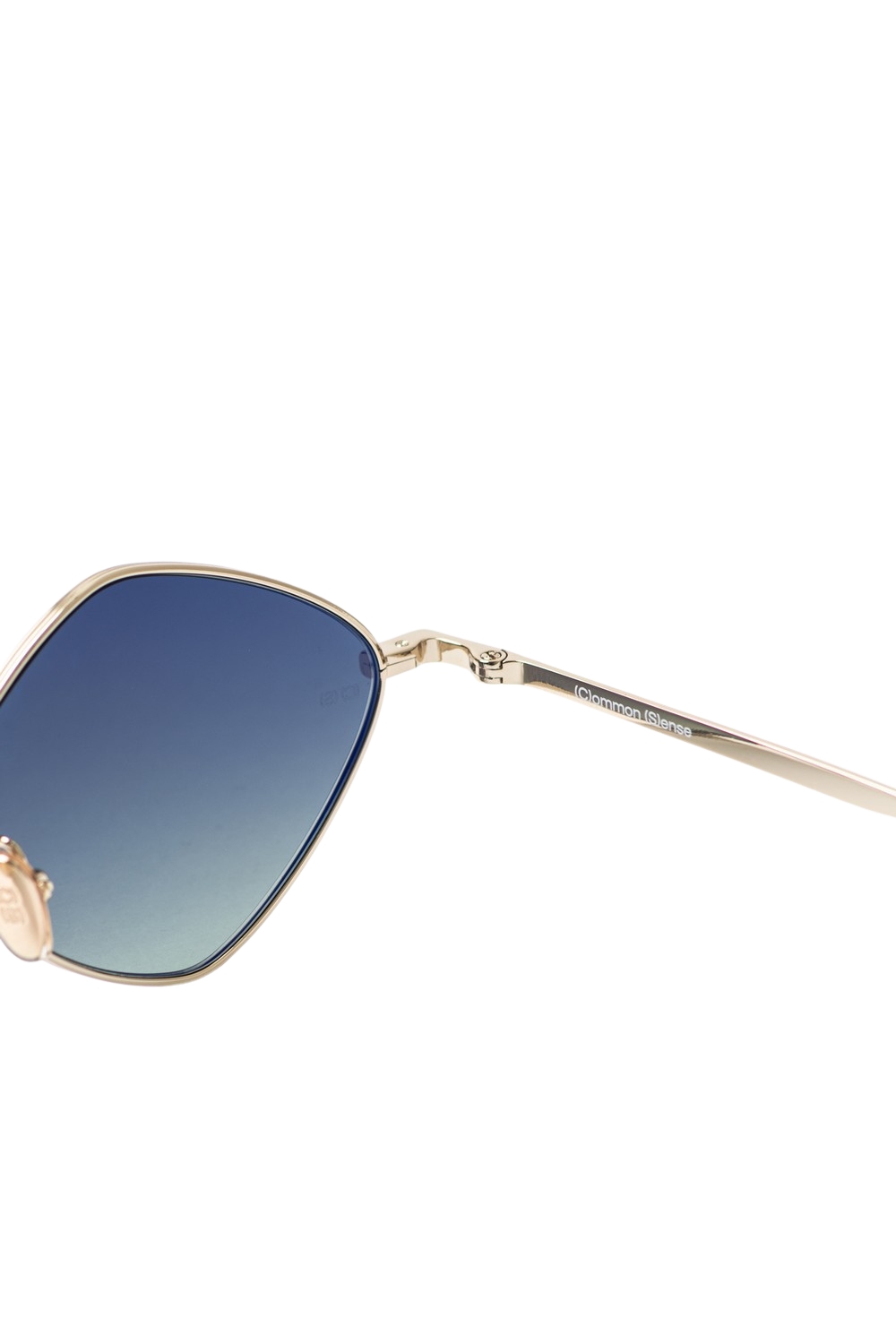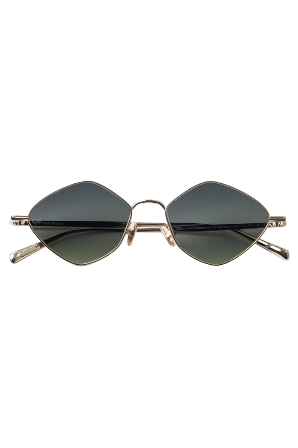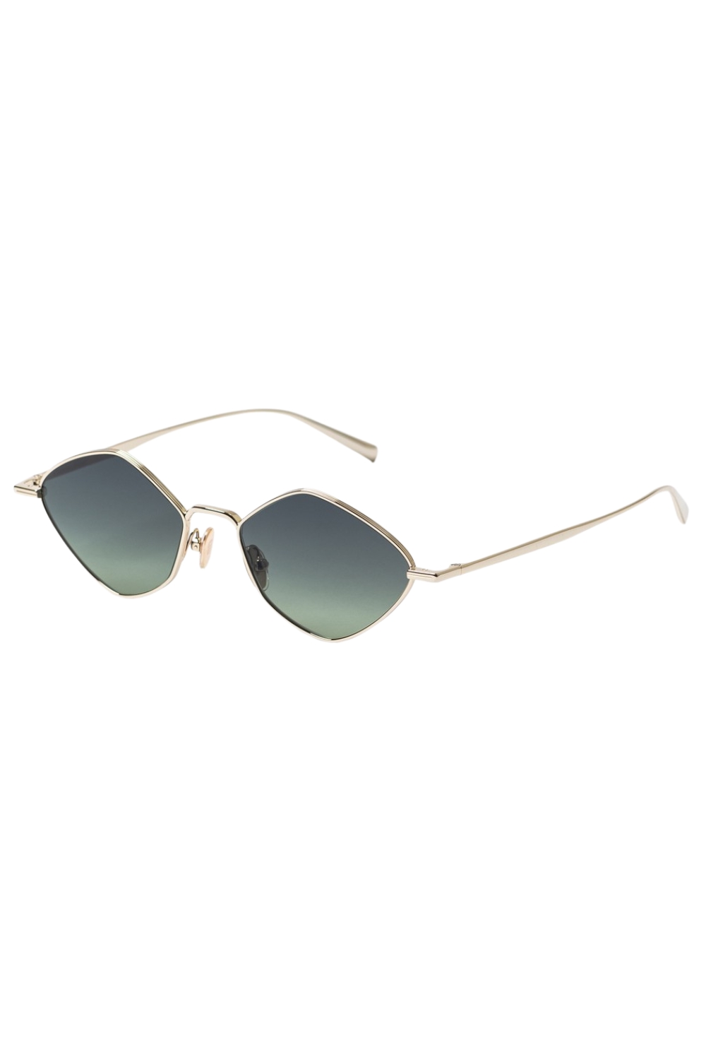 Made of metal , 024 in Shiny Gold with G15 lenses and anti-reflective coating is a geometric shaped sunglass frame.