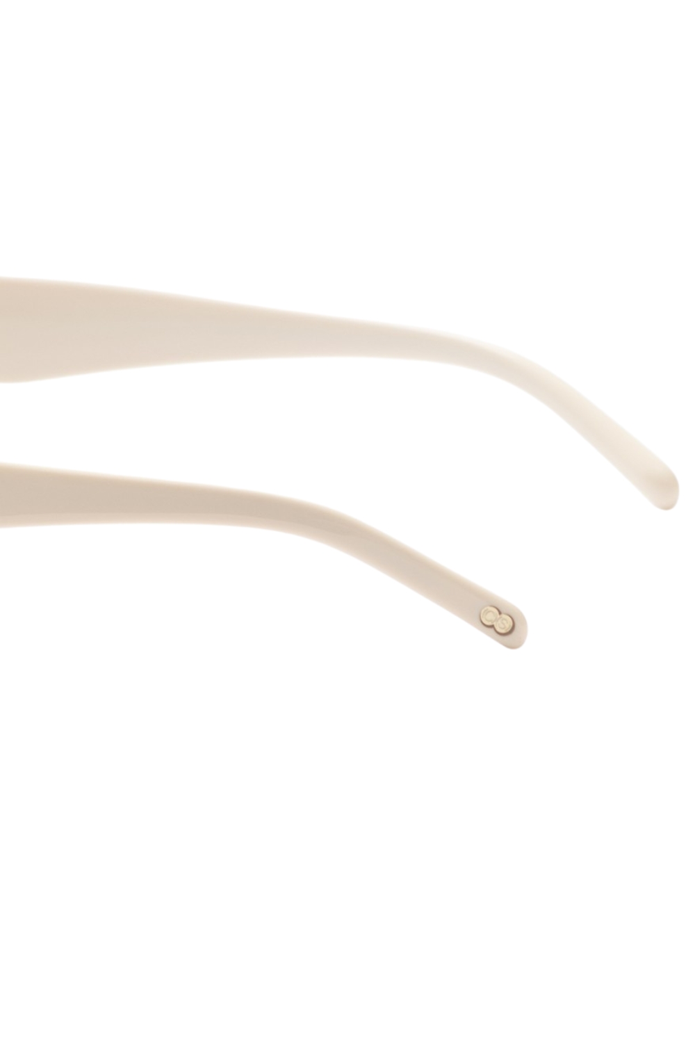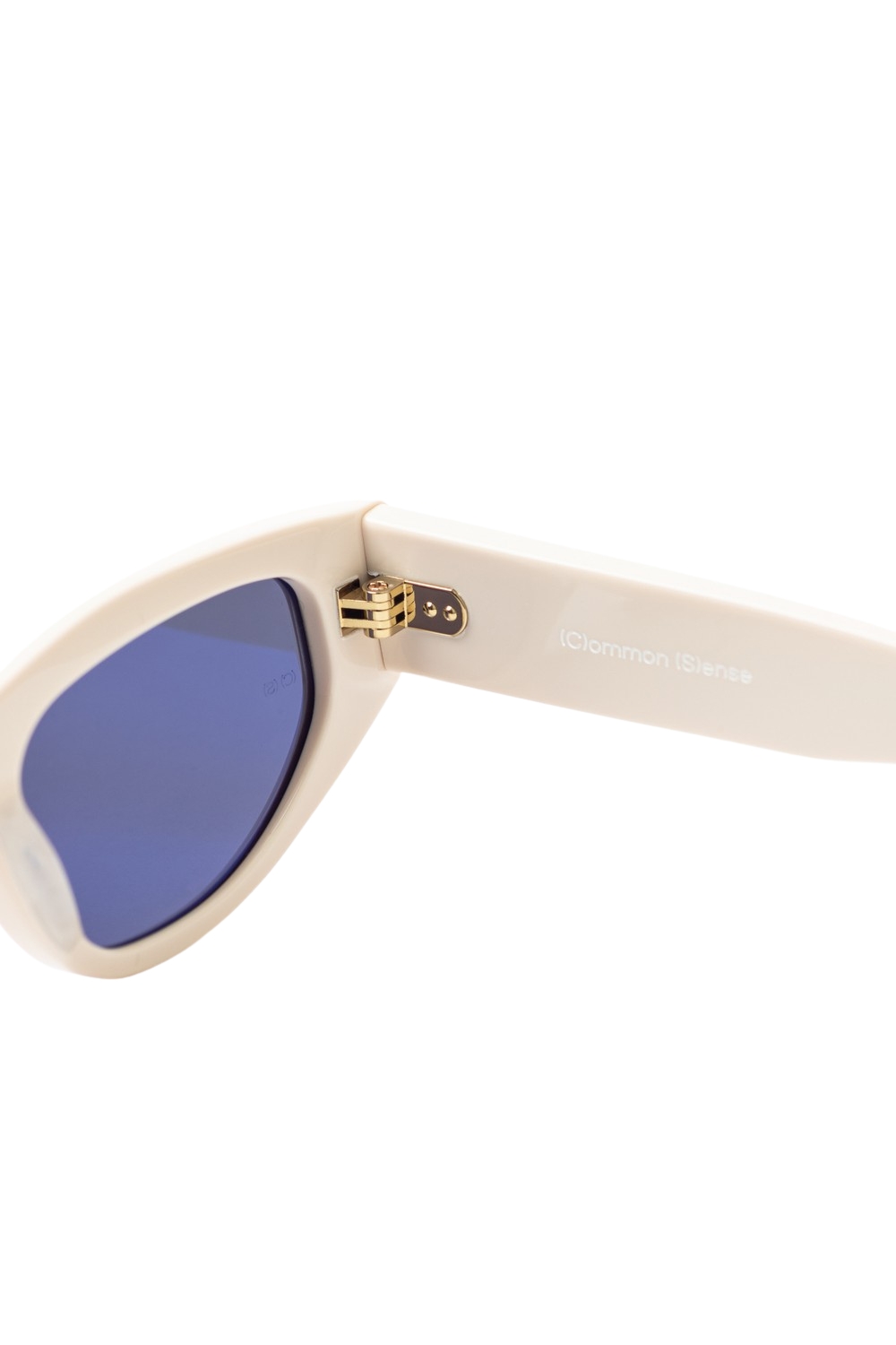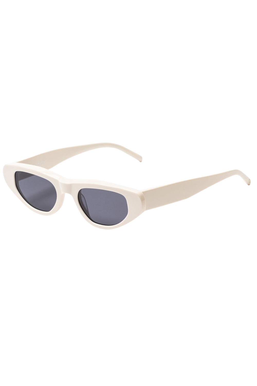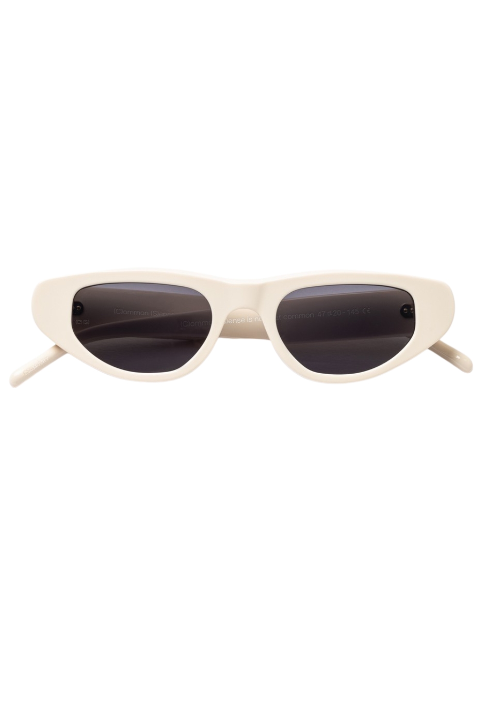 Made of acetate , 034 in Ivory with Dark Grey lenses and anti-reflective coating is a cat eye shaped sunglass frame.