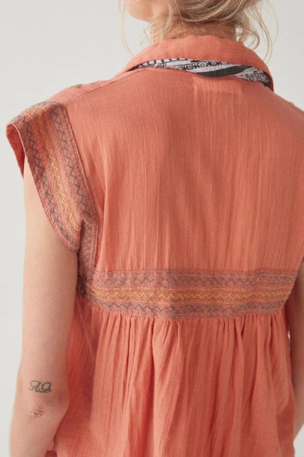 The button-up blouse features delicate single-thread embroidery across the shoulder and back; the ruffles on the bottom giving the blouse a relaxed bohemian vibe.