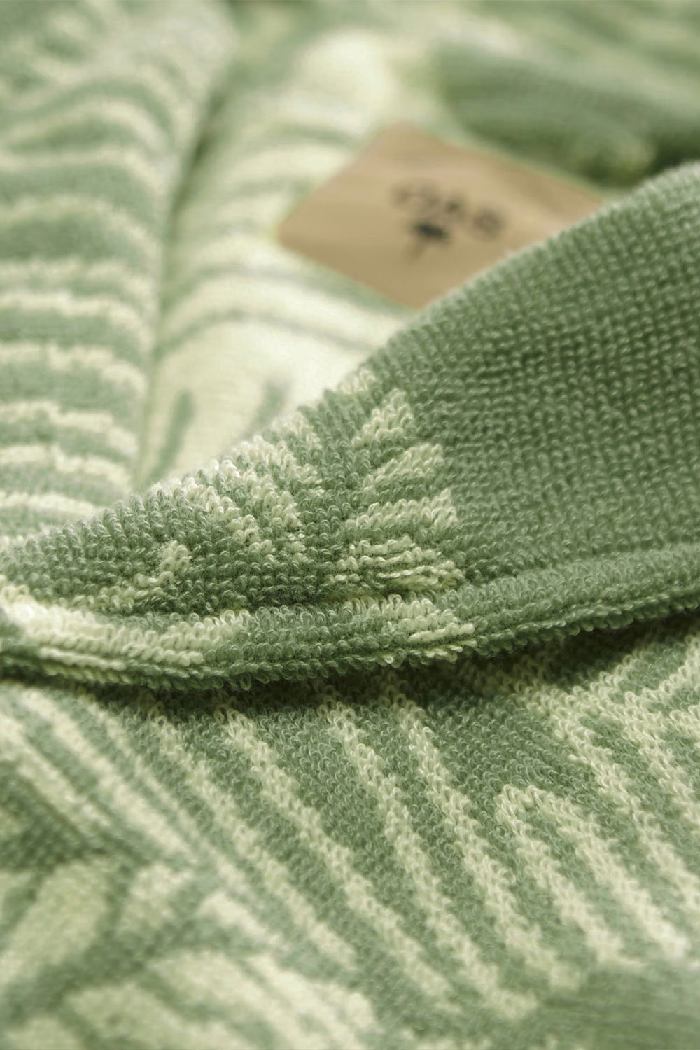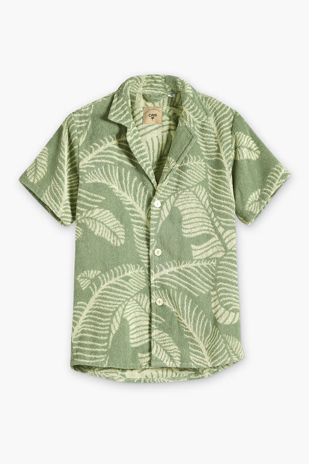 The Banana Leaf Cuba terry shirt is jacquard-woven with a verdant green foliage pattern in heavyweight cotton terry. Tailored with a resort collar and tonal buttons running down the front.