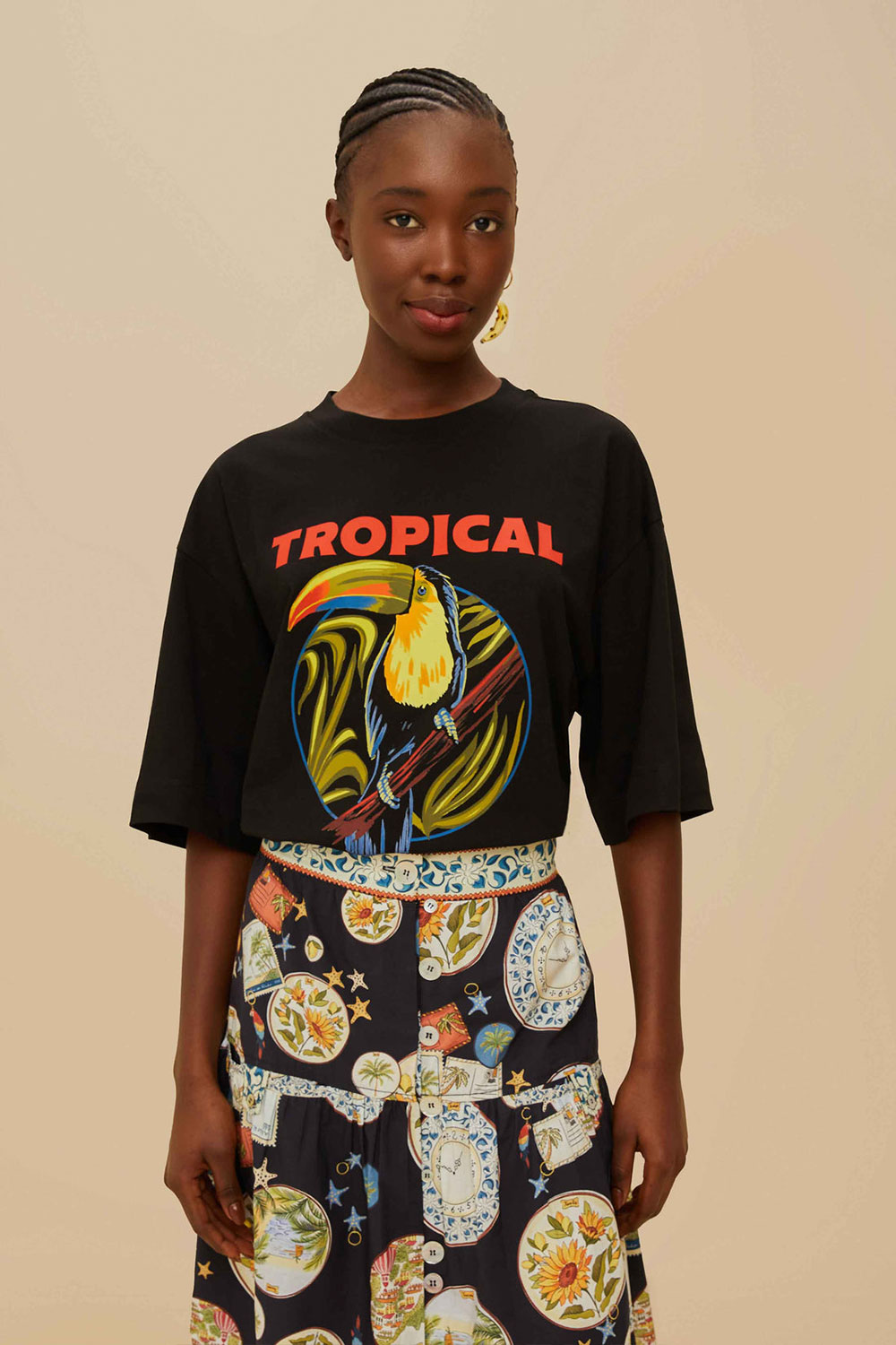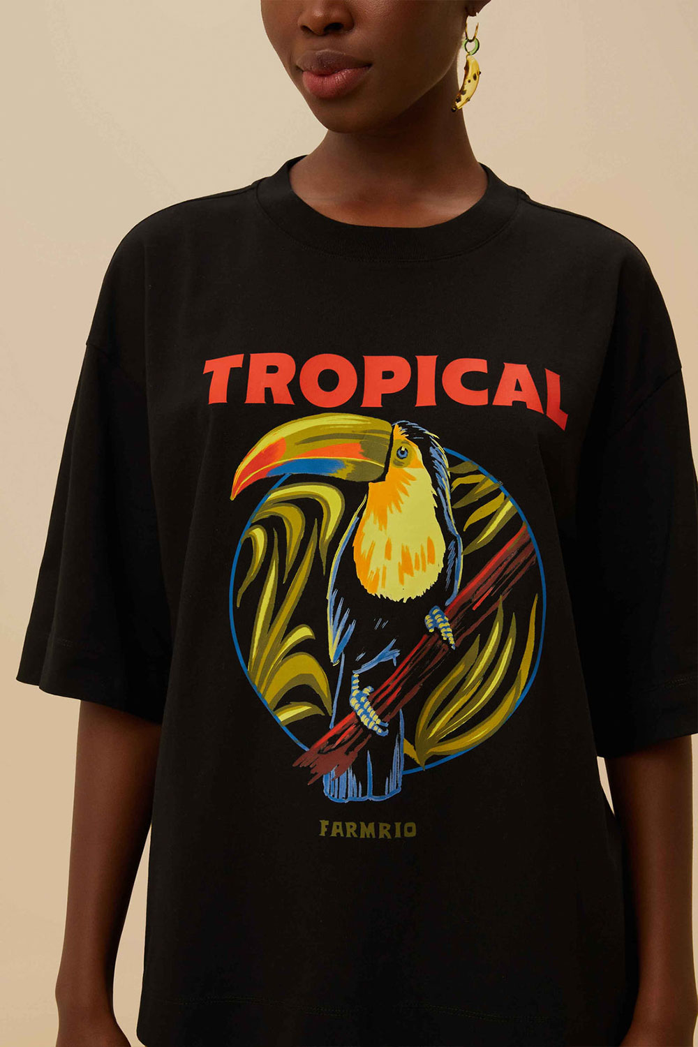 Indulge in vibrant charm with the Black Tropical Organic Cotton T-Shirt by FARM Rio. Crafted from responsible materials, this playful piece flaunts a vivid toucan print, enlivened by a burst of lush colors. The relaxed silhouette, complemented by a classic round neckline, offers effortless style for any occasion. Perfect for those who adore fashion infused with joyful, tropical vibes. Embrace the spirit of the wild in every wear.