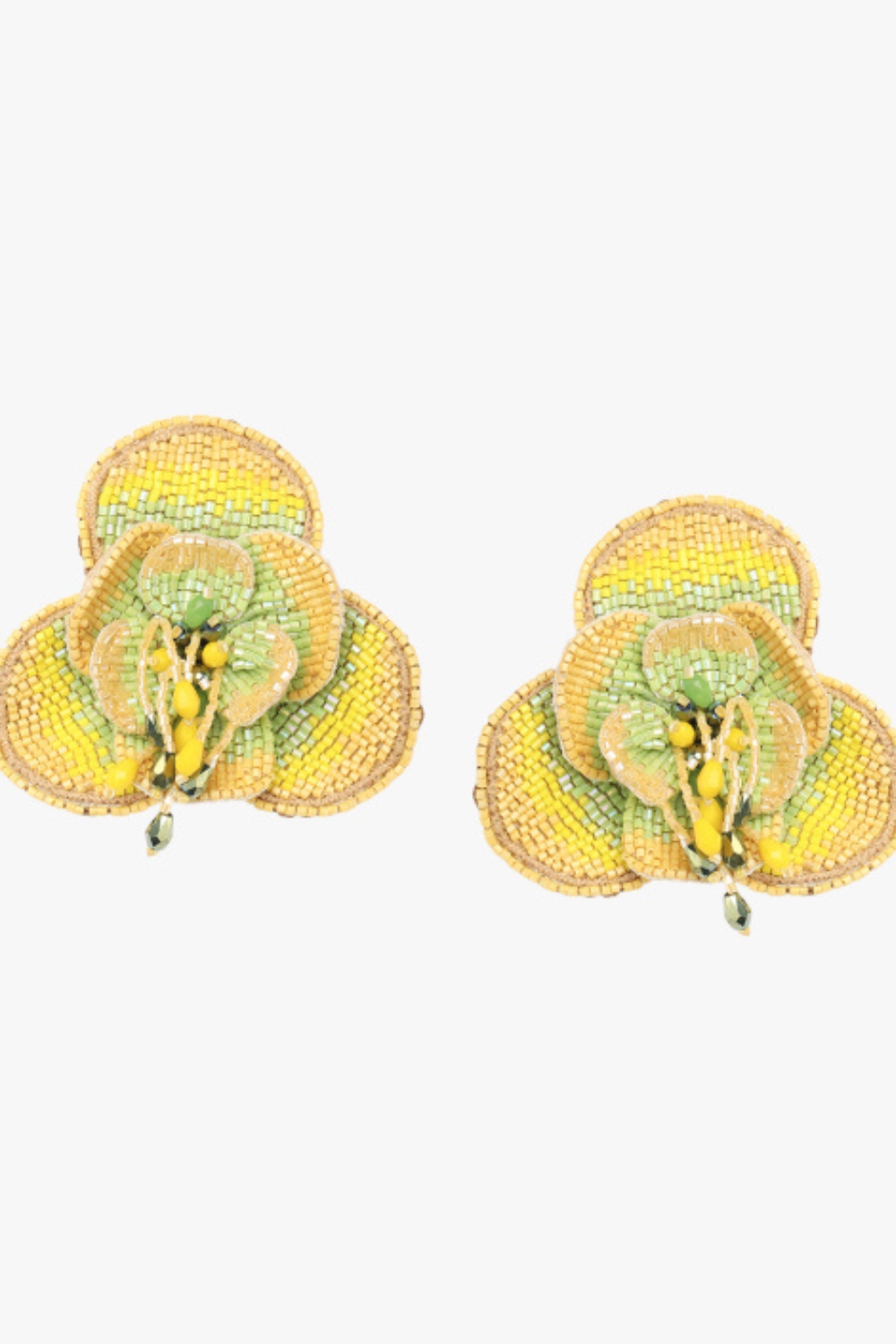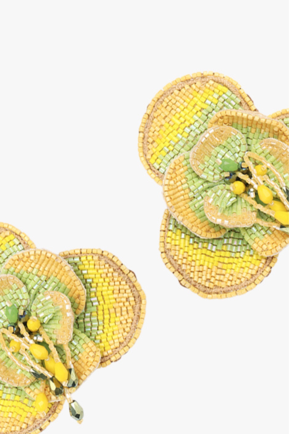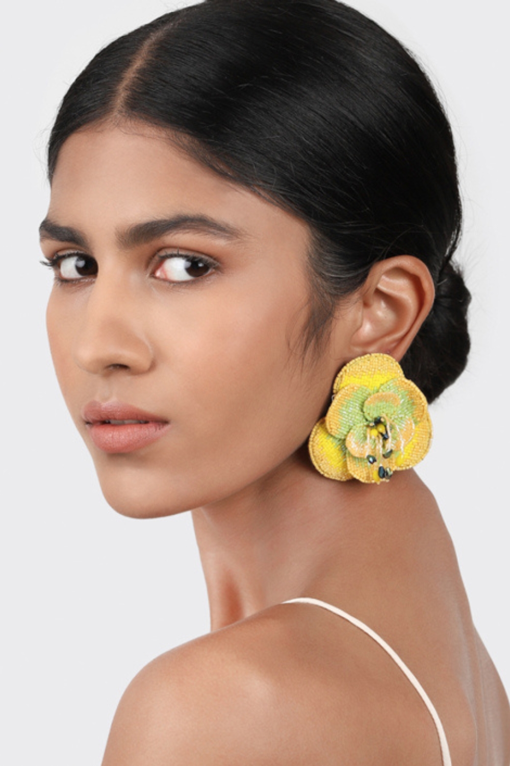 The yellow Camelia earrings are entirely hand-embroidered. Elegant, they are inspired by the timeless beauty of this iconic flower.