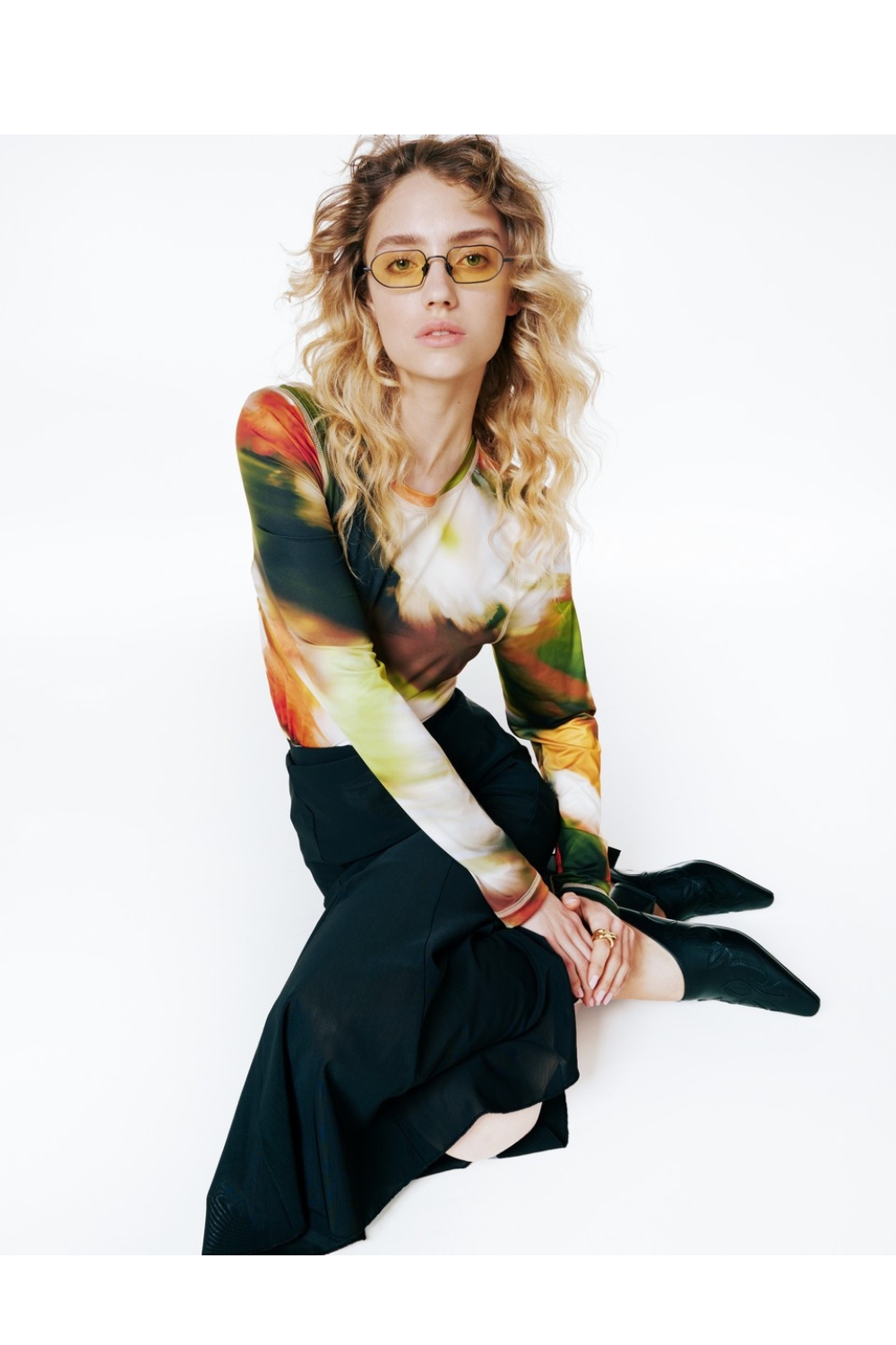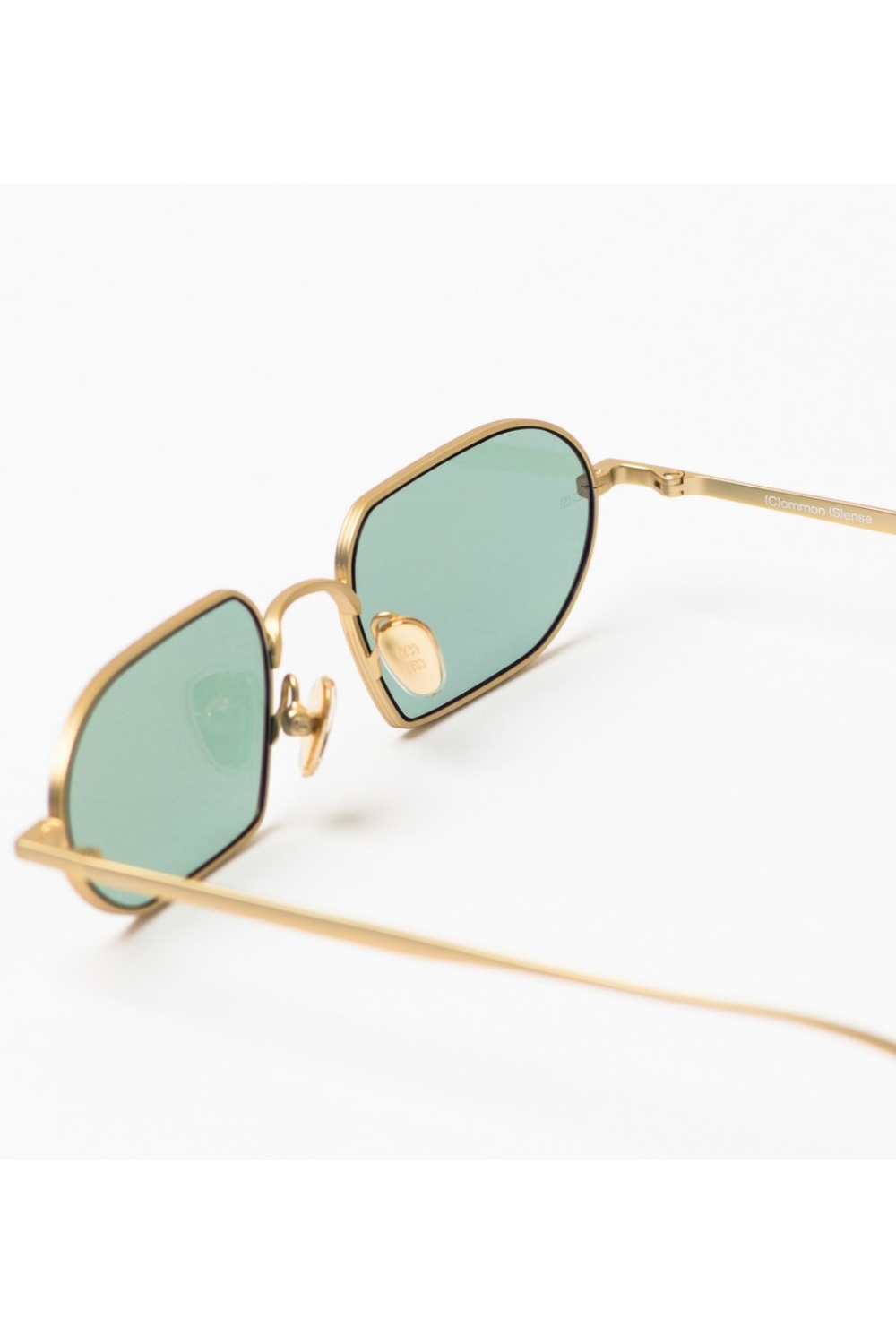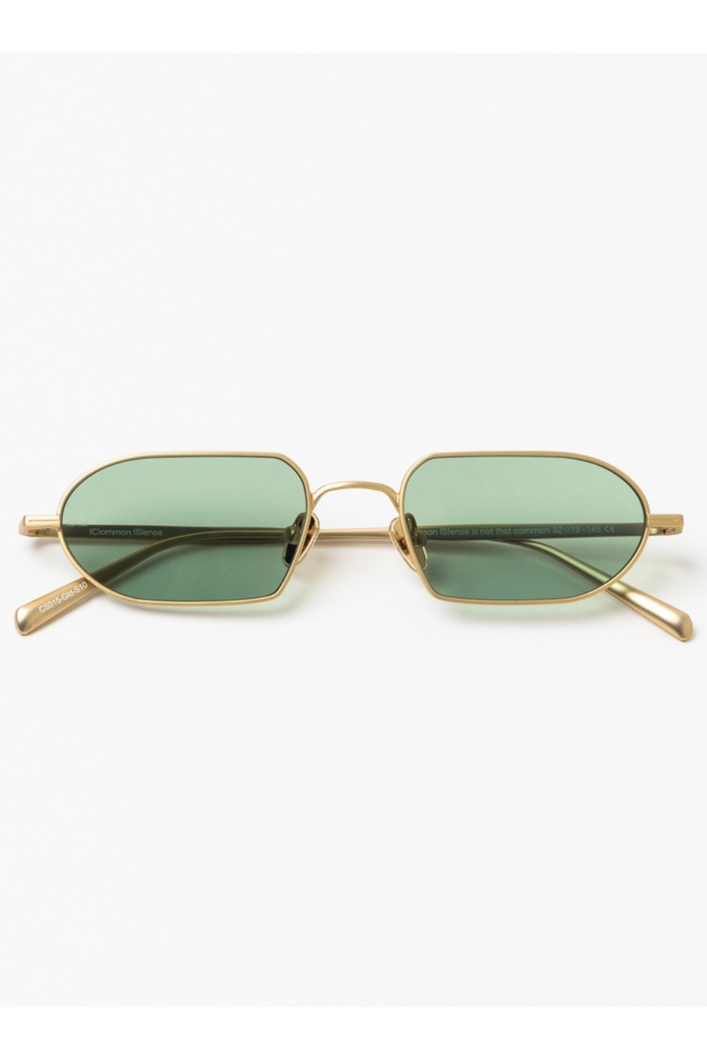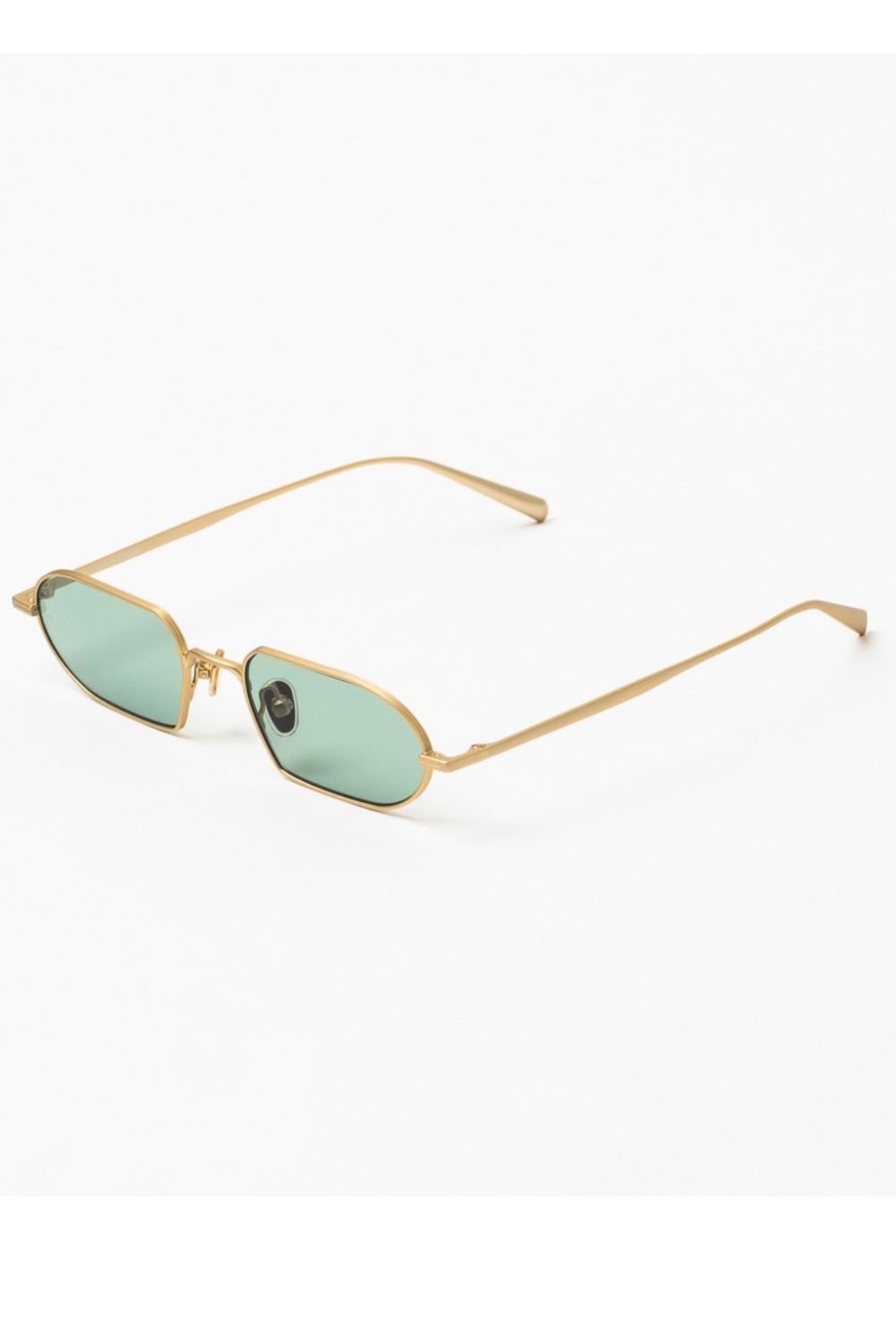 Made of metal, 015 in Gold with Light Green lenses and anti-reflective coating is a geometric shaped sunglass frame.