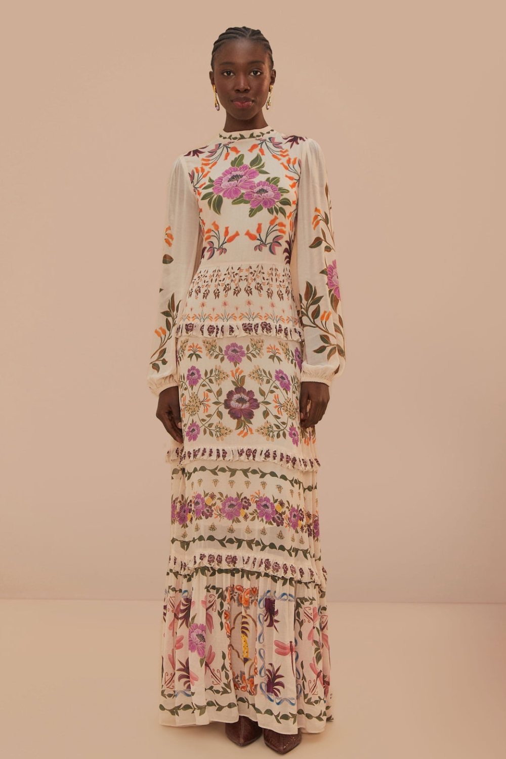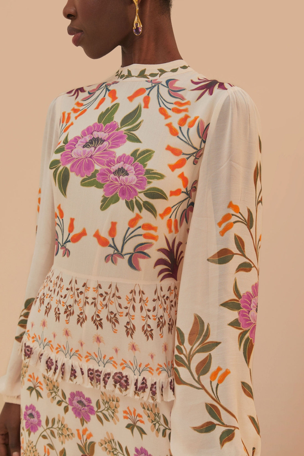 Envelop yourself in the botanical bliss of the Cream Winter Garden Ruffle Maxi Dress, a picturesque piece from FARM Rio. Its high neckline elegantly frames the face, while the lush garden-inspired print blooms across a cream canvas. Ruffle accents cascade gracefully down this maxi silhouette, inviting a dance of movement and earthy charm. Each tier whispers stories of enchanting forests, transforming every step into a walk through nature’s artistry.