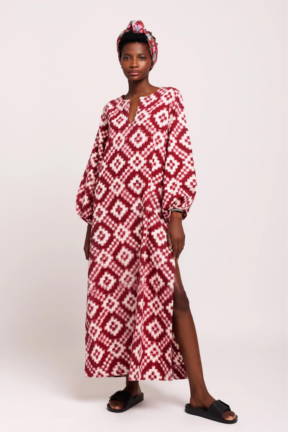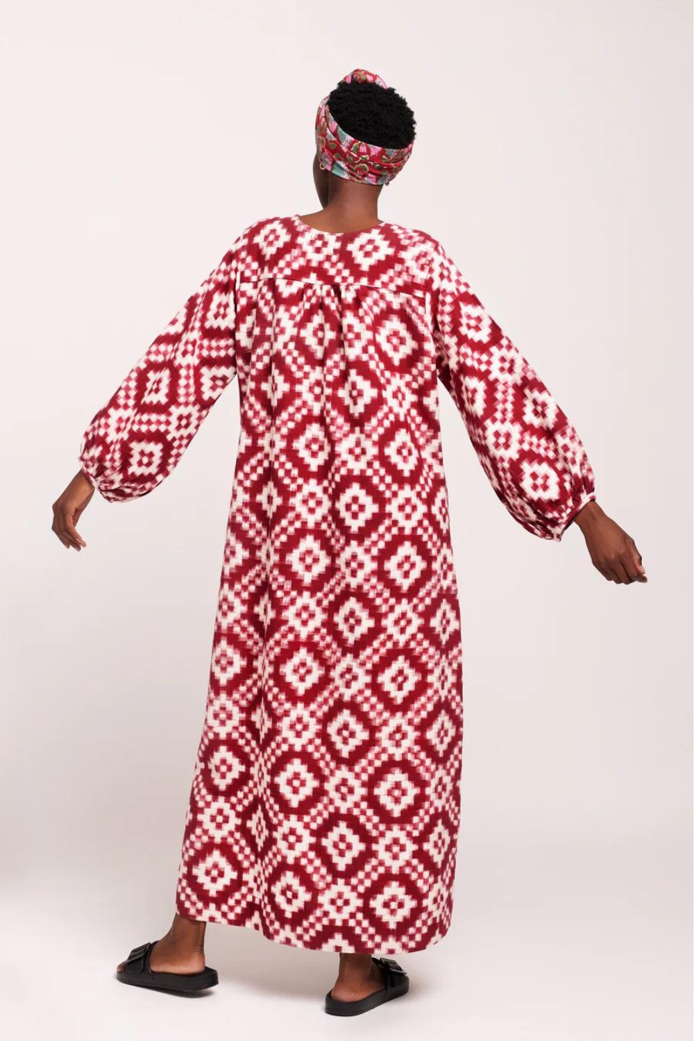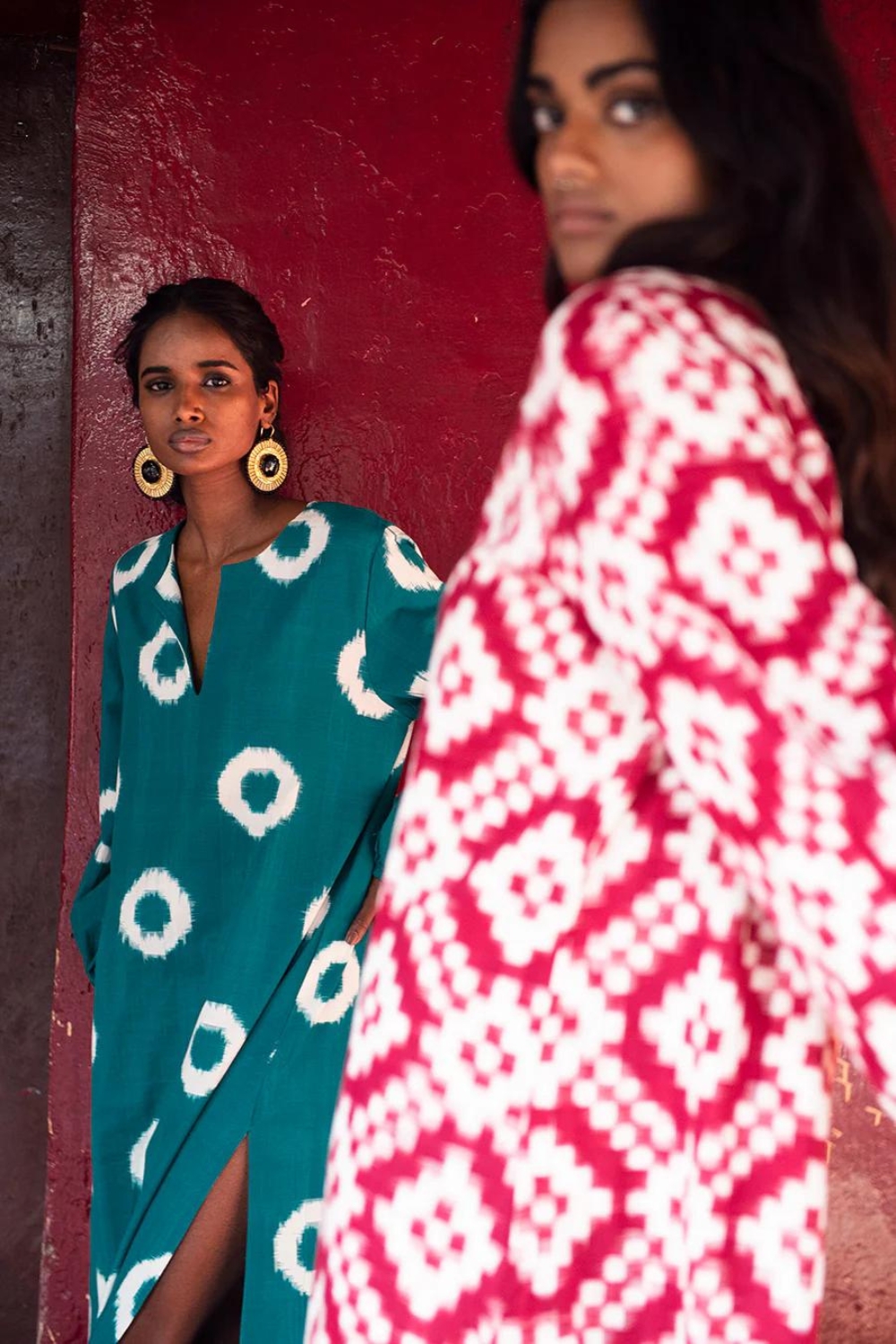 Handcrafted using age-old techniques, the double IKAT kaftans feature 100% cotton yarns that are resist-dyed, twirled, and skillfully hand-loomed to create a shaded-pattern effect.