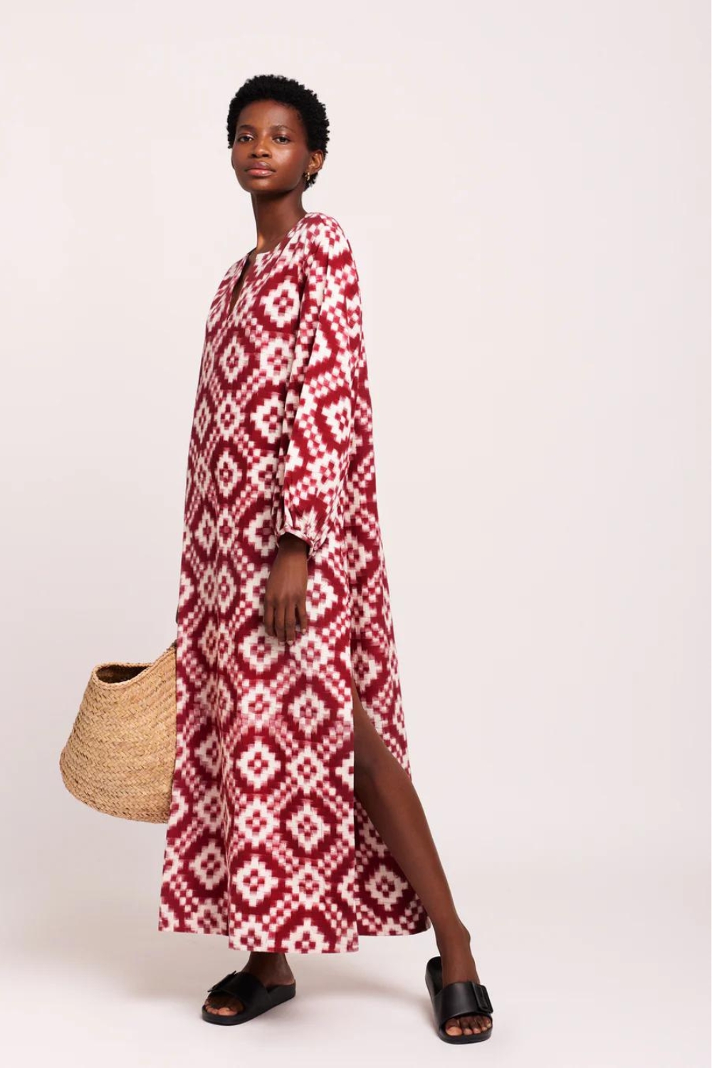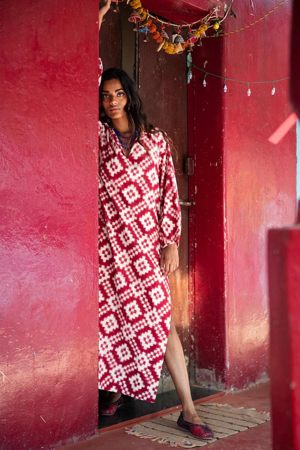 The Dorcas Red Kaftan from KLEED is a vibrant and striking piece with a stunning geometric ruby red and white pattern, reminiscent of sunbaked roof tiles under a hot African sun. This statement kaftan is versatile, taking you seamlessly from day to nightwear.