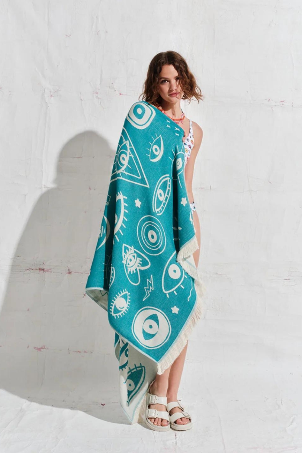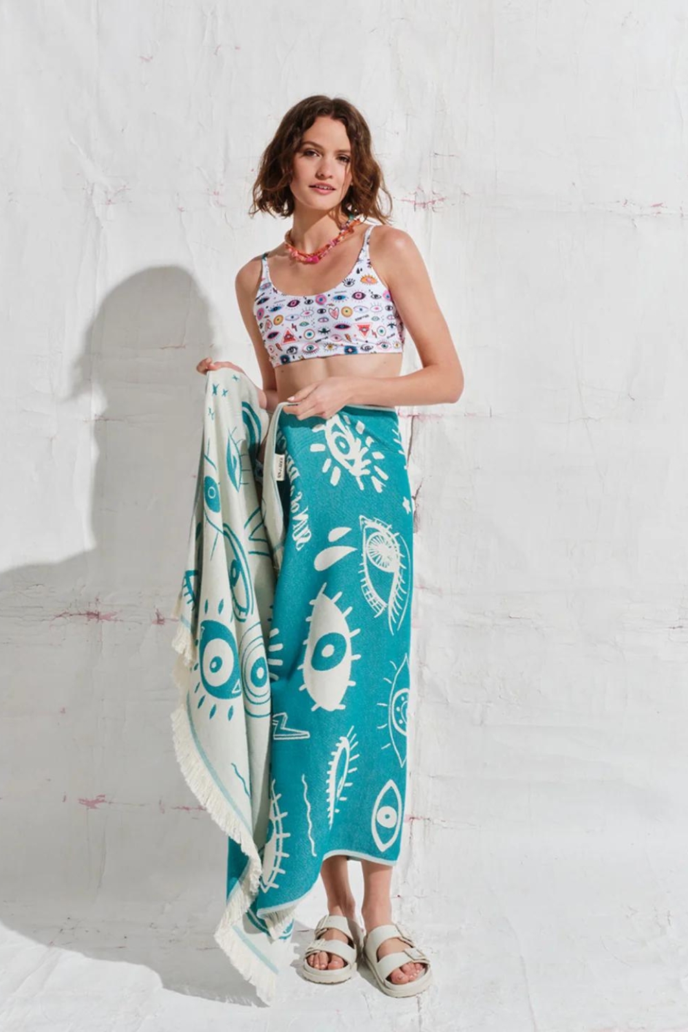 The Electric Eyes Feather Beach towel in petrol is the only sightseeing you’ll need to do this summer. Made in Greece from 100% cotton, it’s very absorbent and light as a feather, inspiring multiple uses on and off the beach. It can be used as a towel, a head wrap, a pareo, or even worn as a shawl after the sun sets. The only limit is your imagination!