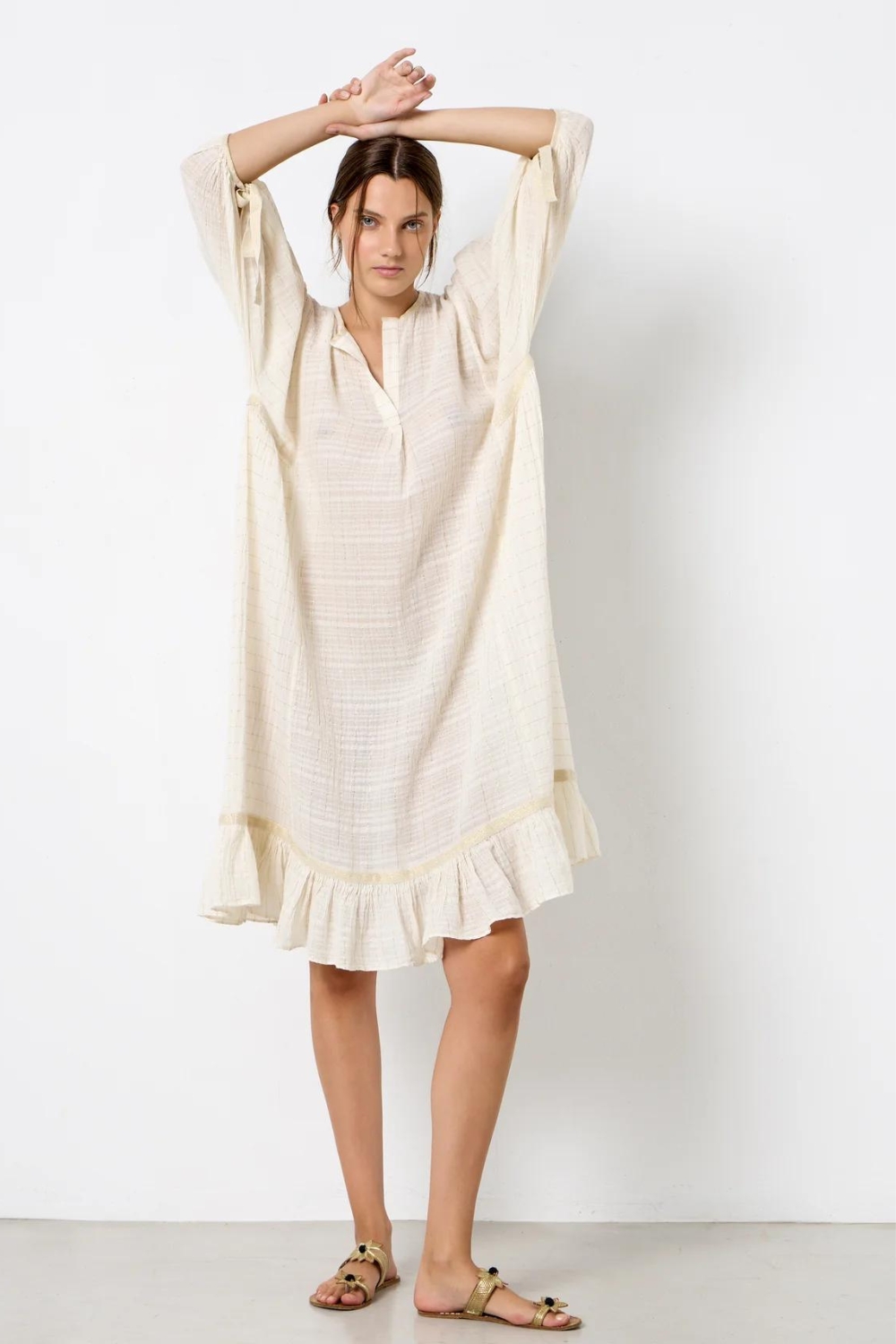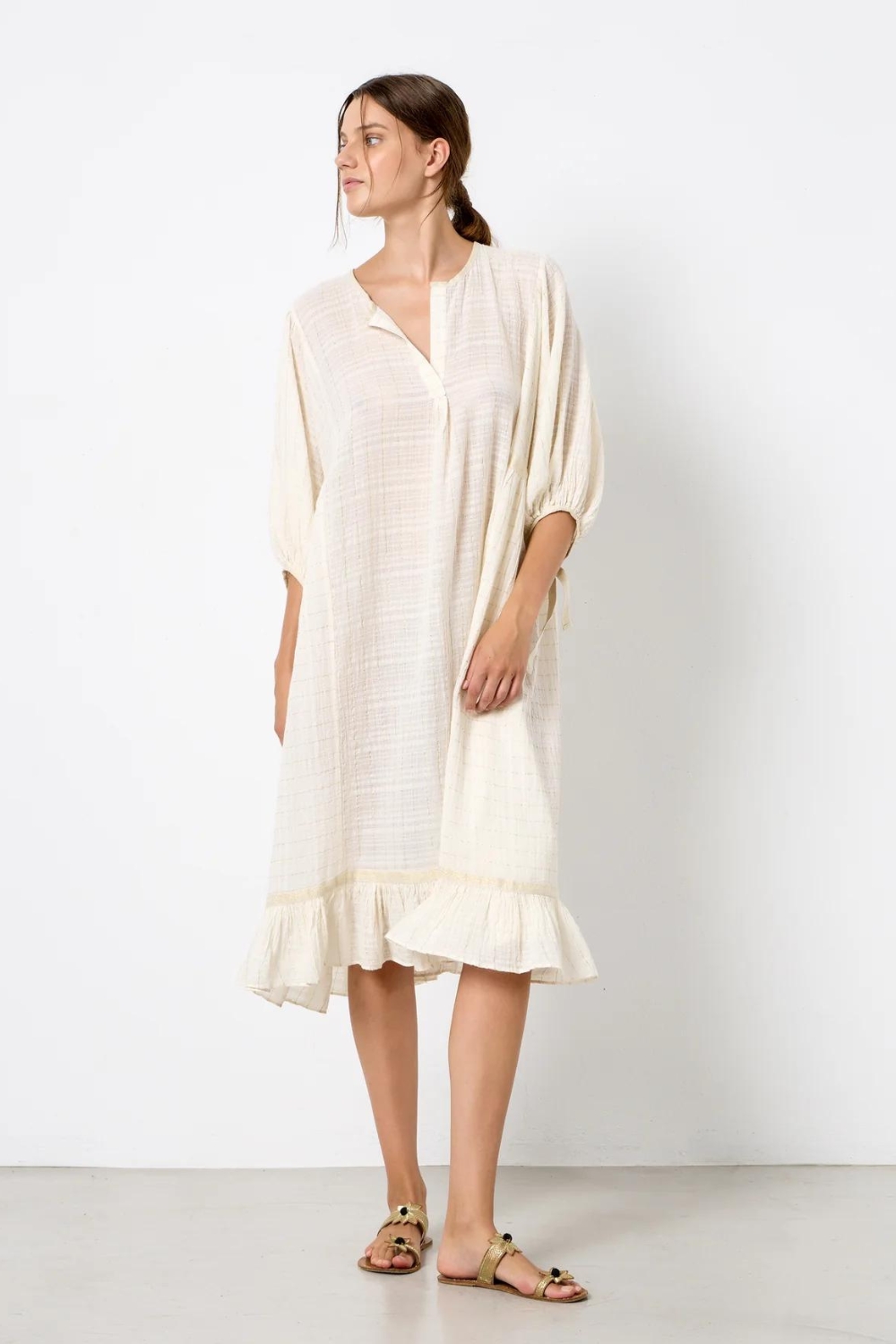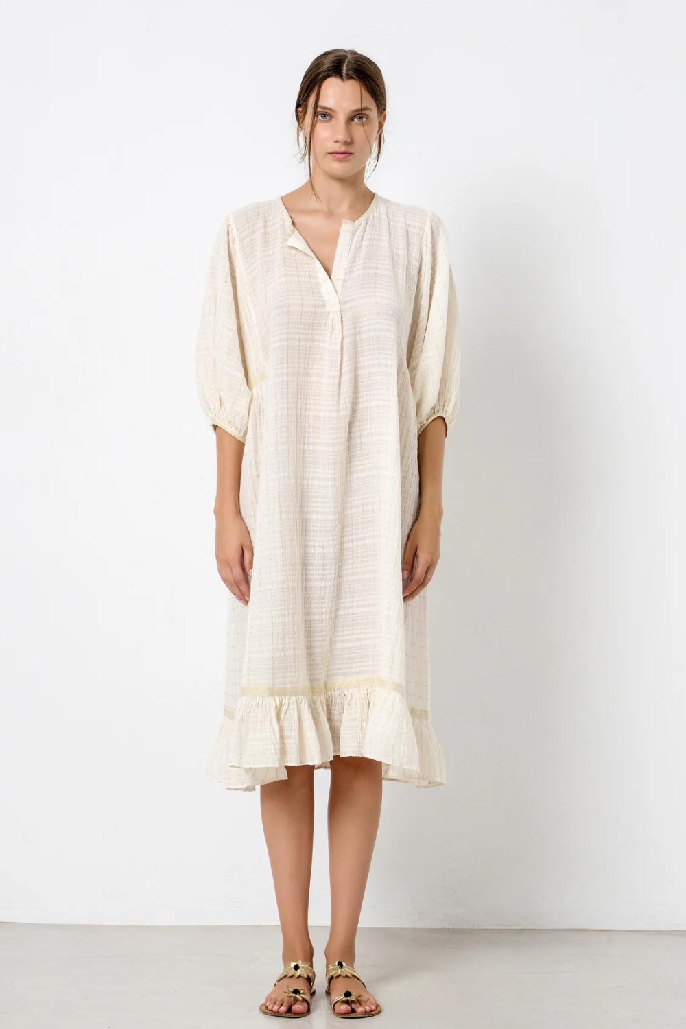 A midi dress with 3/4 sleeves crafted from 100% cotton gauze with gold lurex details.