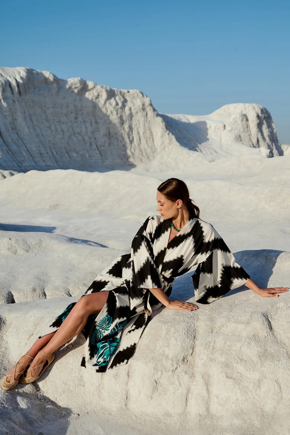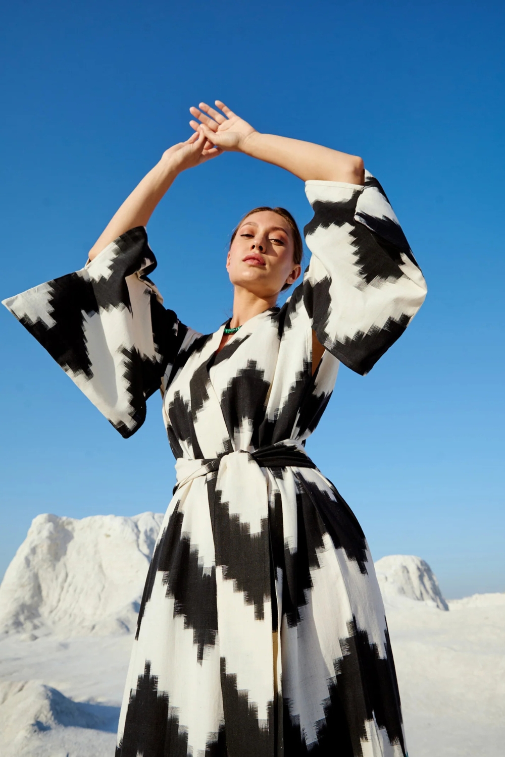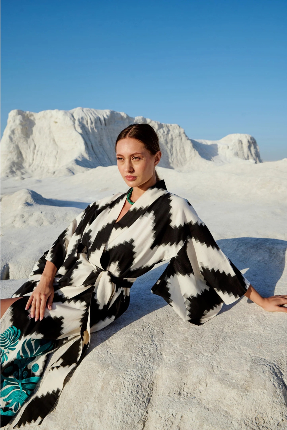 Make a statement with the Jain Black Double IKAT Kimono by KLEED. Featuring a bold black and white zig-zag pattern and striking teal-green silk leaf embroidery along the hem, this artisan kimono is handloomed from 100% cotton using traditional double IKAT techniques. The double-breasted kimono collar, detachable wide belt, and two size options offer versatile, flattering style for day or night. Ethically crafted by skilled artisans, this slow fashion piece supports ancient weaving traditions and eco-friendly practices. Perfect for luxury resort stays, beach days, or elegant evenings.