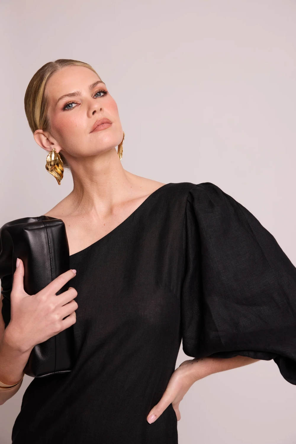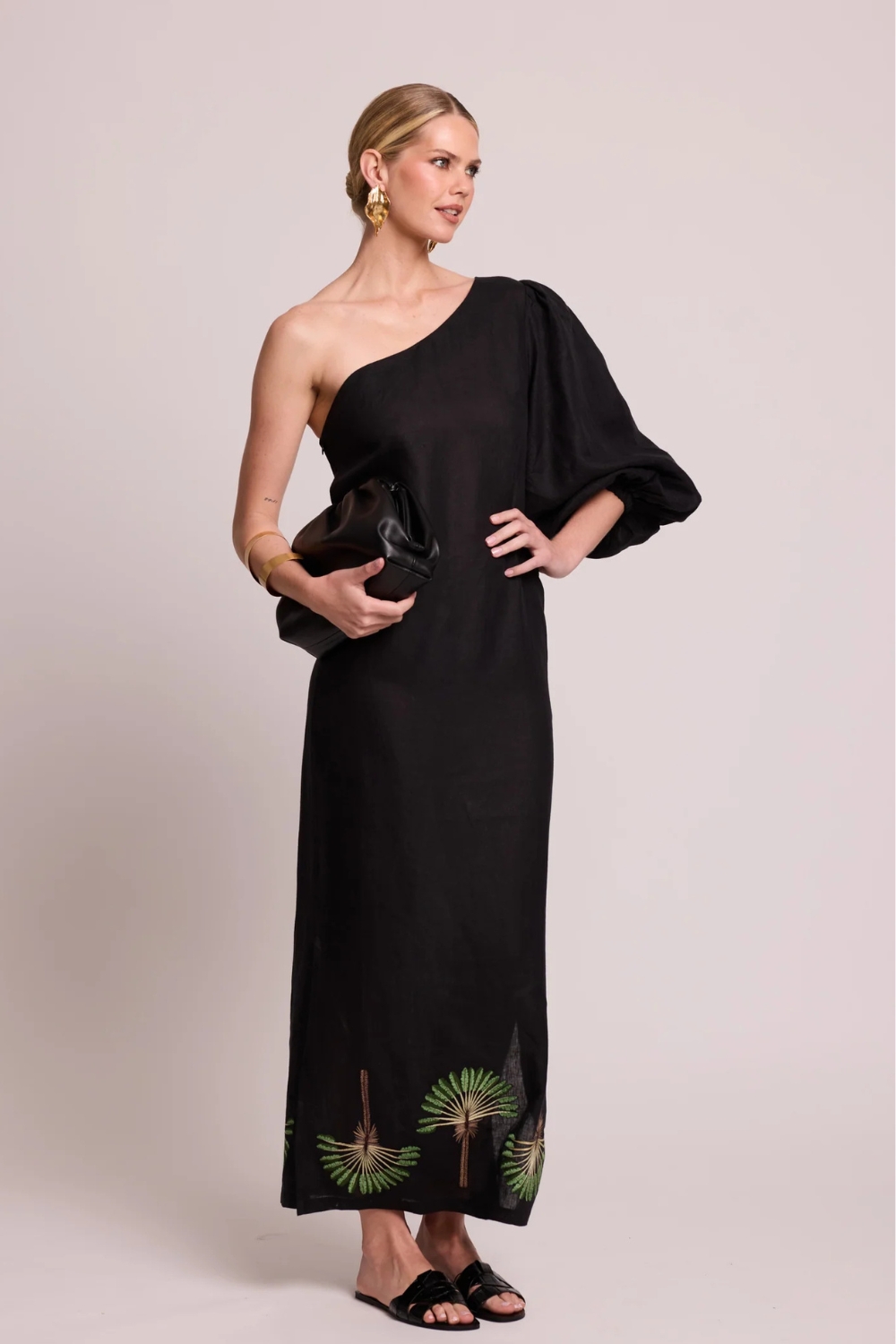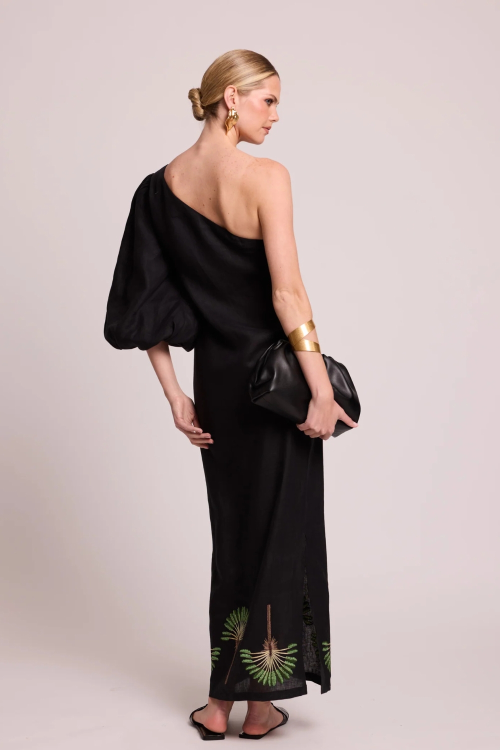 The Keeri Black Dress is a stunning one-shoulder piece crafted from luxurious 100% linen, perfect for those who value timeless glamour and refined style. Beautifully hand-embroidered at the bottom with elegant palm tree motifs, this dress creates a striking visual contrast that radiates sophistication and quiet mystery.