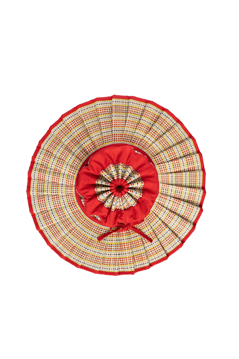 Kiki Beach features an eclectic blend of thick scarlet red, duck-egg blue, sunflower yellow, purple and white thread colours woven throughout its natural grass fibre base, with scarlet-red fabric trimming.