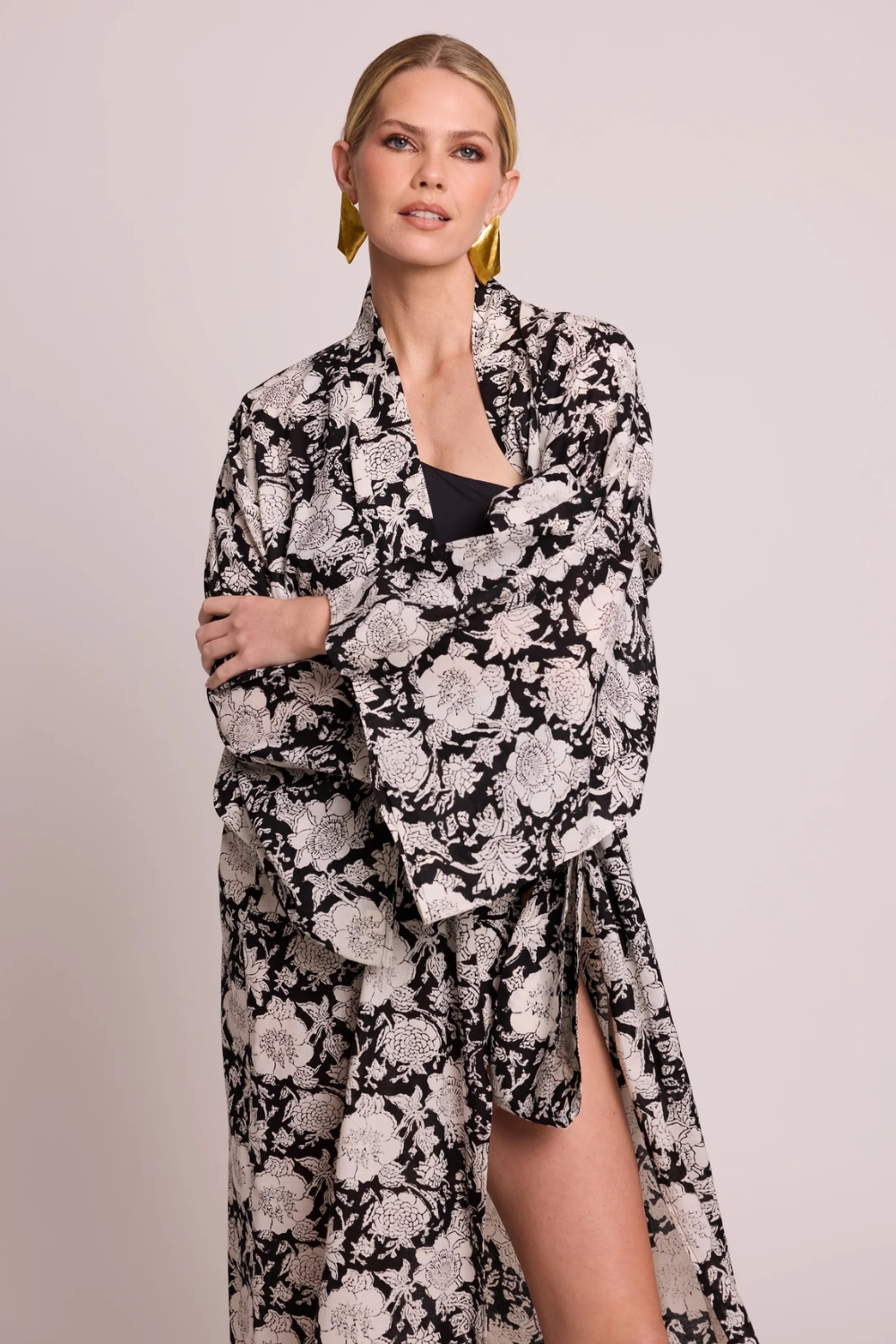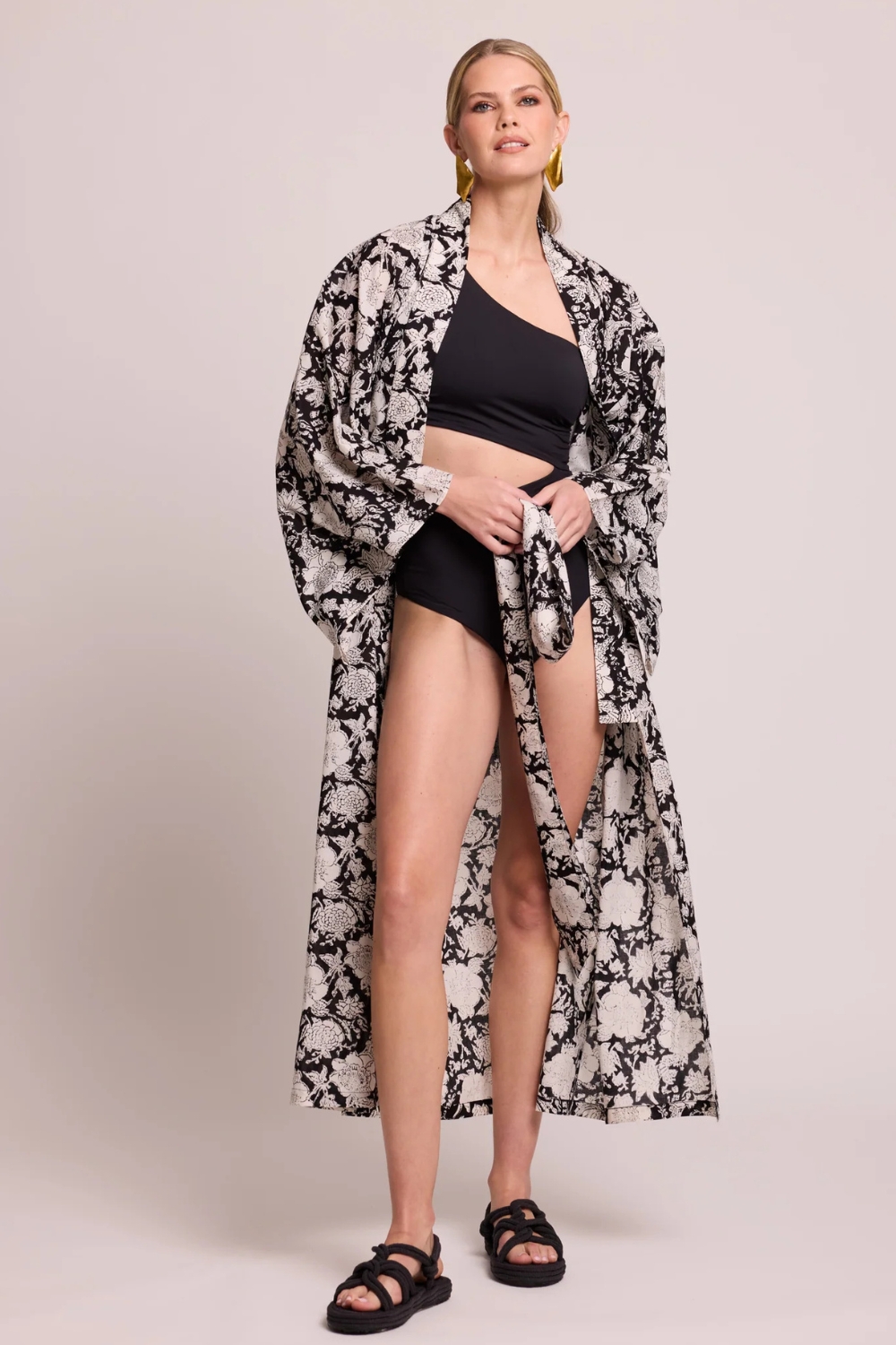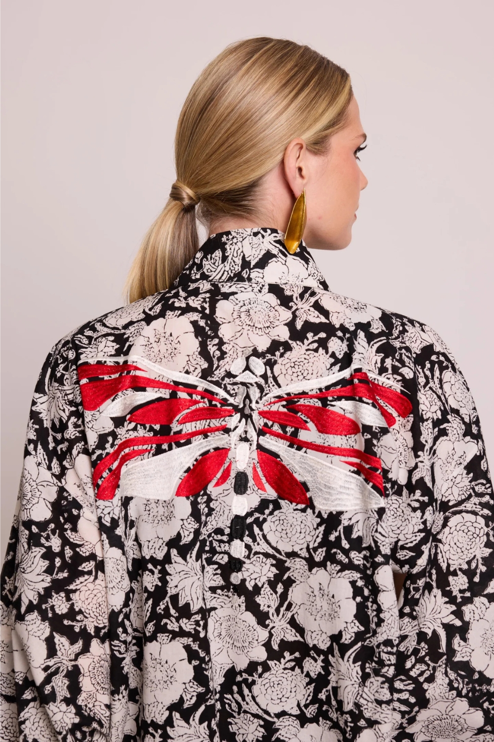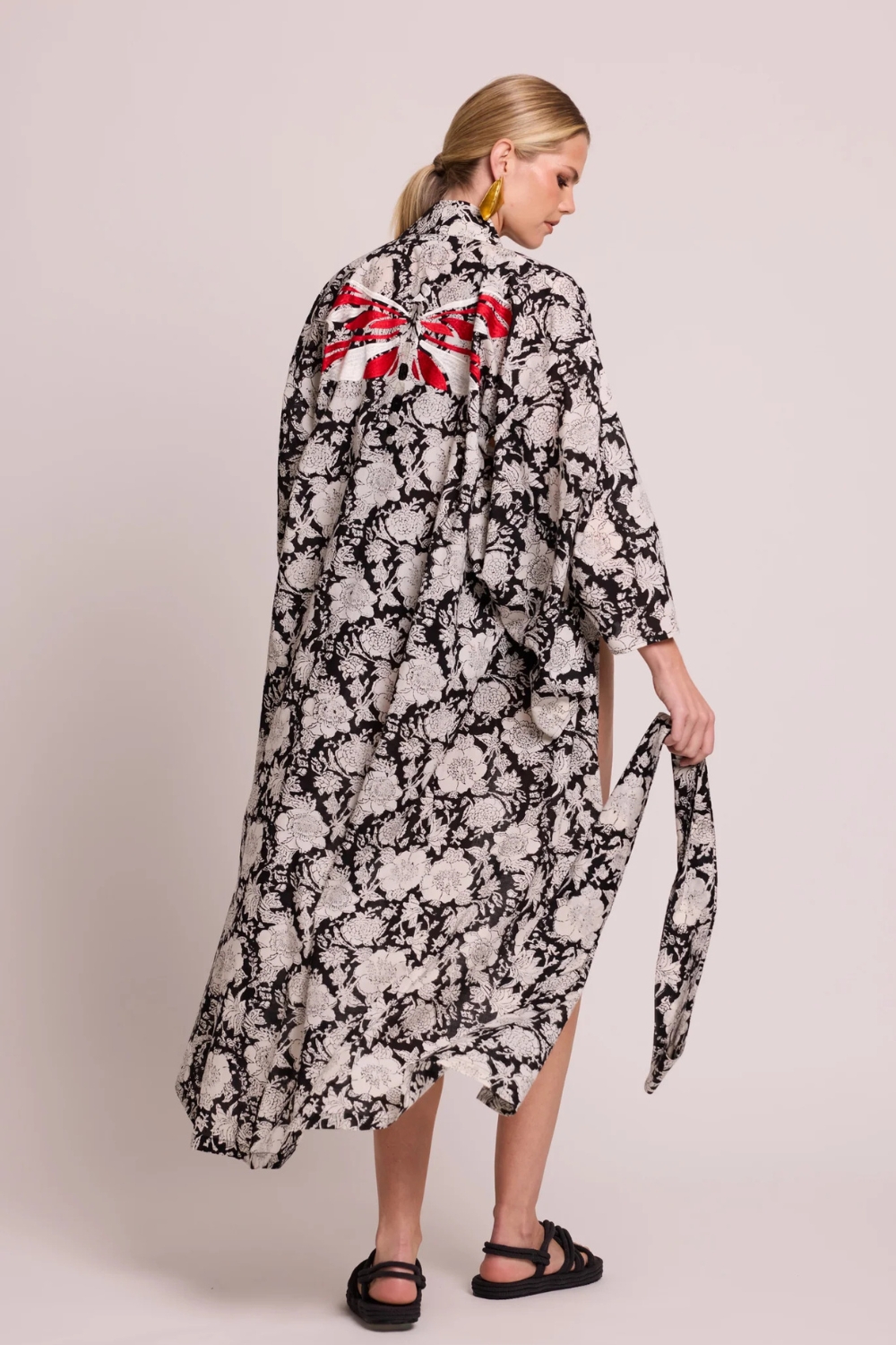The Kiula Black Kimono is a handcrafted summer beachwear essential, made from 100% cotton with a striking black and white floral block print pattern. Featuring a flowing full-length silhouette and ¾-length sleeves, this versatile kimono is elevated by contrasting red dragonfly embroidery on the back, finished with delicate silk detailing for artisanal charm.