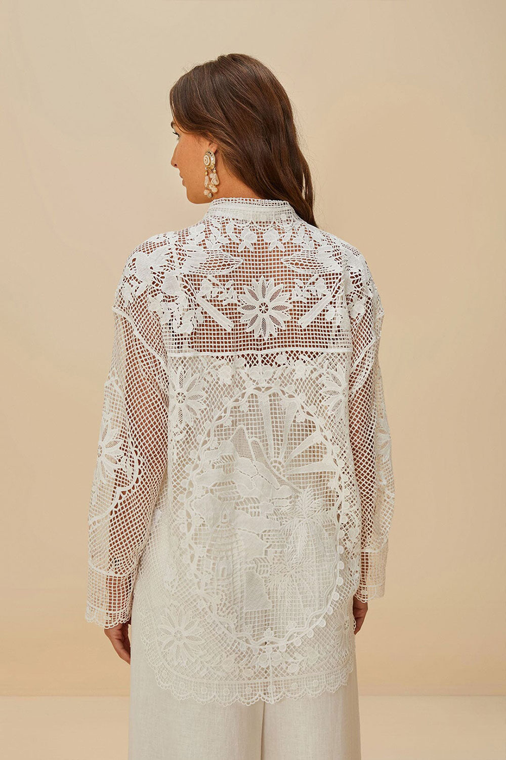 Elevate your wardrobe with the off-white landscape guipure shirt by FARM Rio. This elegant piece features intricate guipure lace patterns that depict a serene landscape, offering a touch of nature’s artistry. The delicately crafted collar neckline adds sophistication, while the lightweight lace promises airy comfort. Perfectly blending warmth and playfulness, this shirt invites softness and style to any outing, making it a versatile addition to your ensemble.