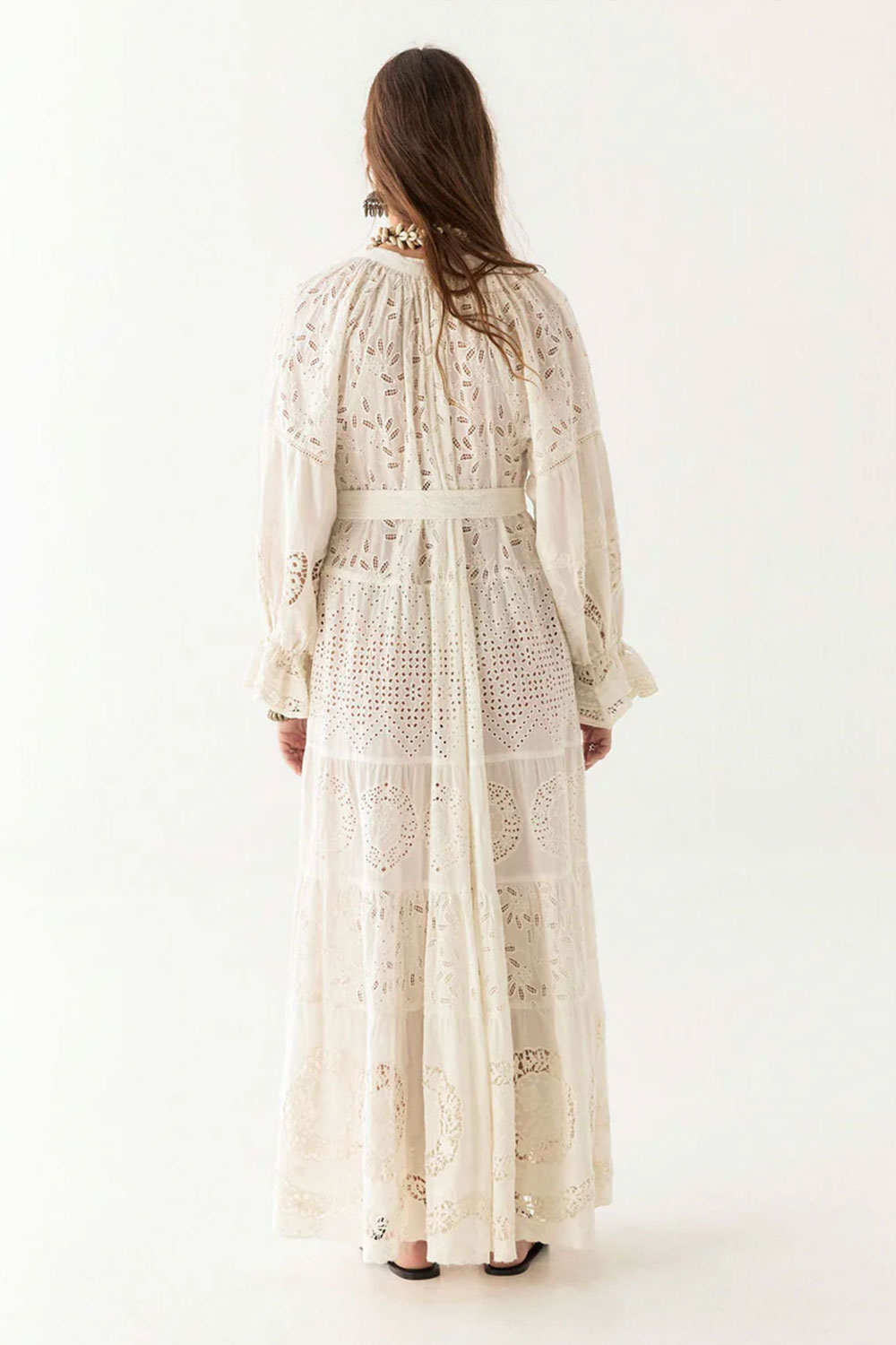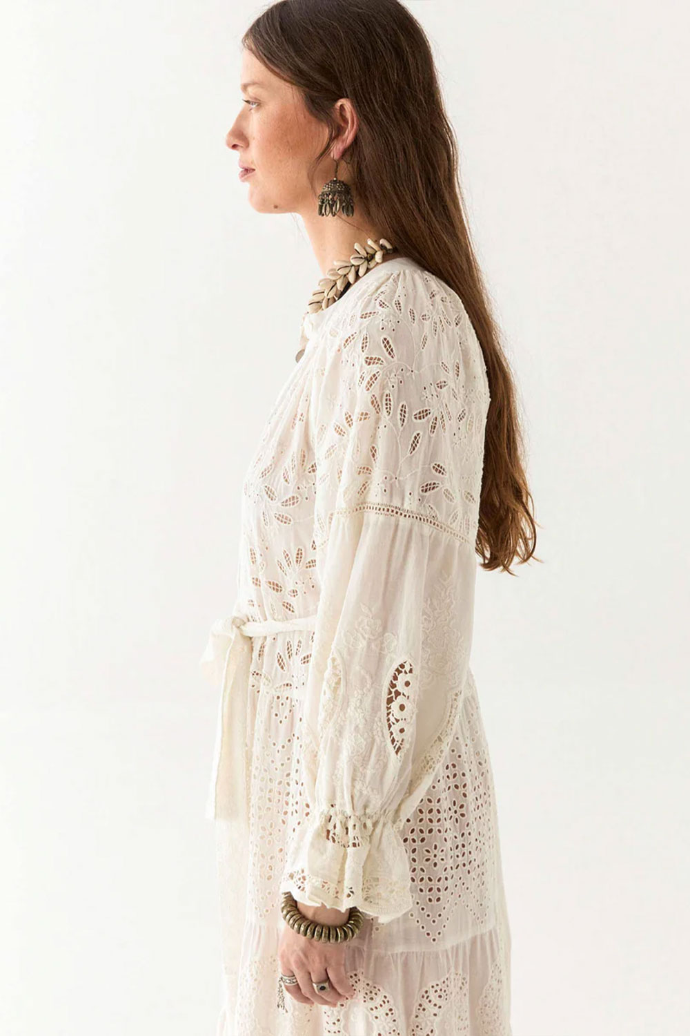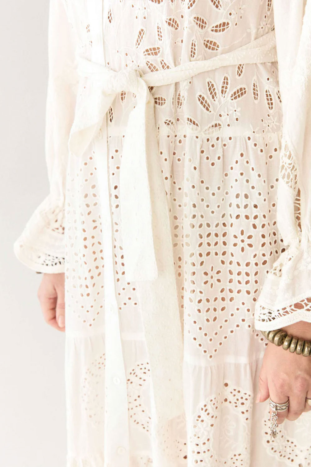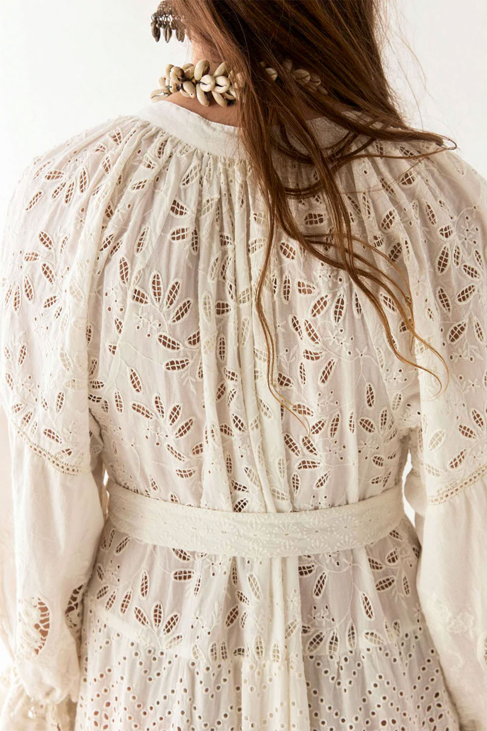 The embroidery is carefully placed to highlight the dress’s fluid structure, while the eyelet cut-outs add depth and texture without overwhelming the design. Subtle pin tucks on the bodice and gathered sleeves enhance the soft volume, giving it a natural drape that moves gracefully. A matching belt cinches the waist for a defined yet relaxed silhouette.