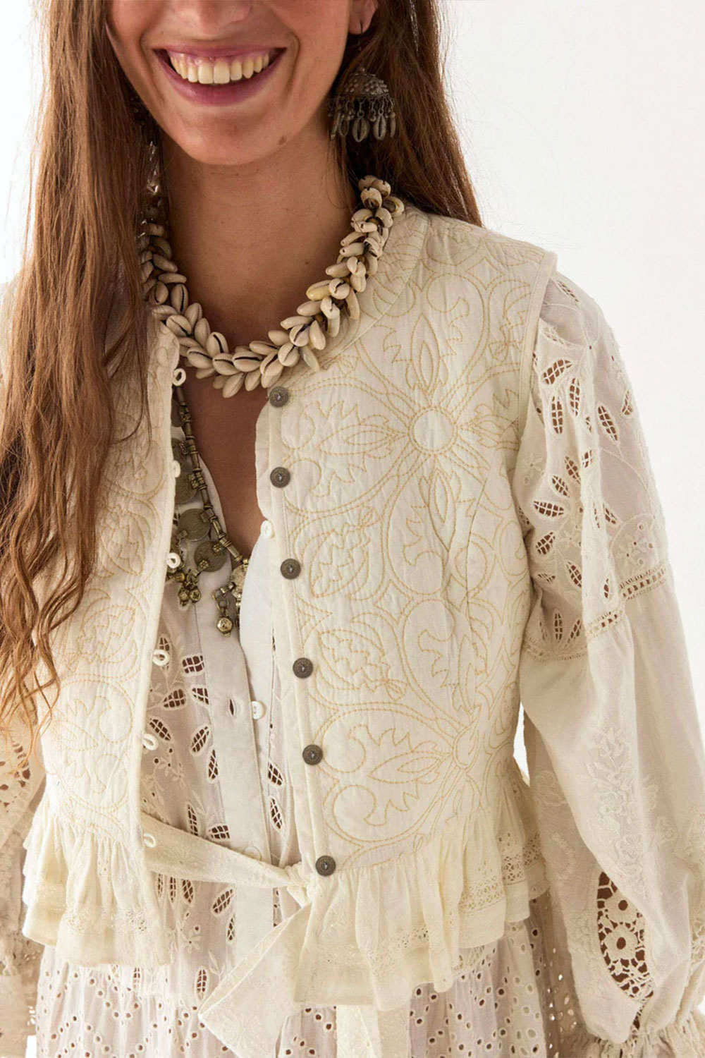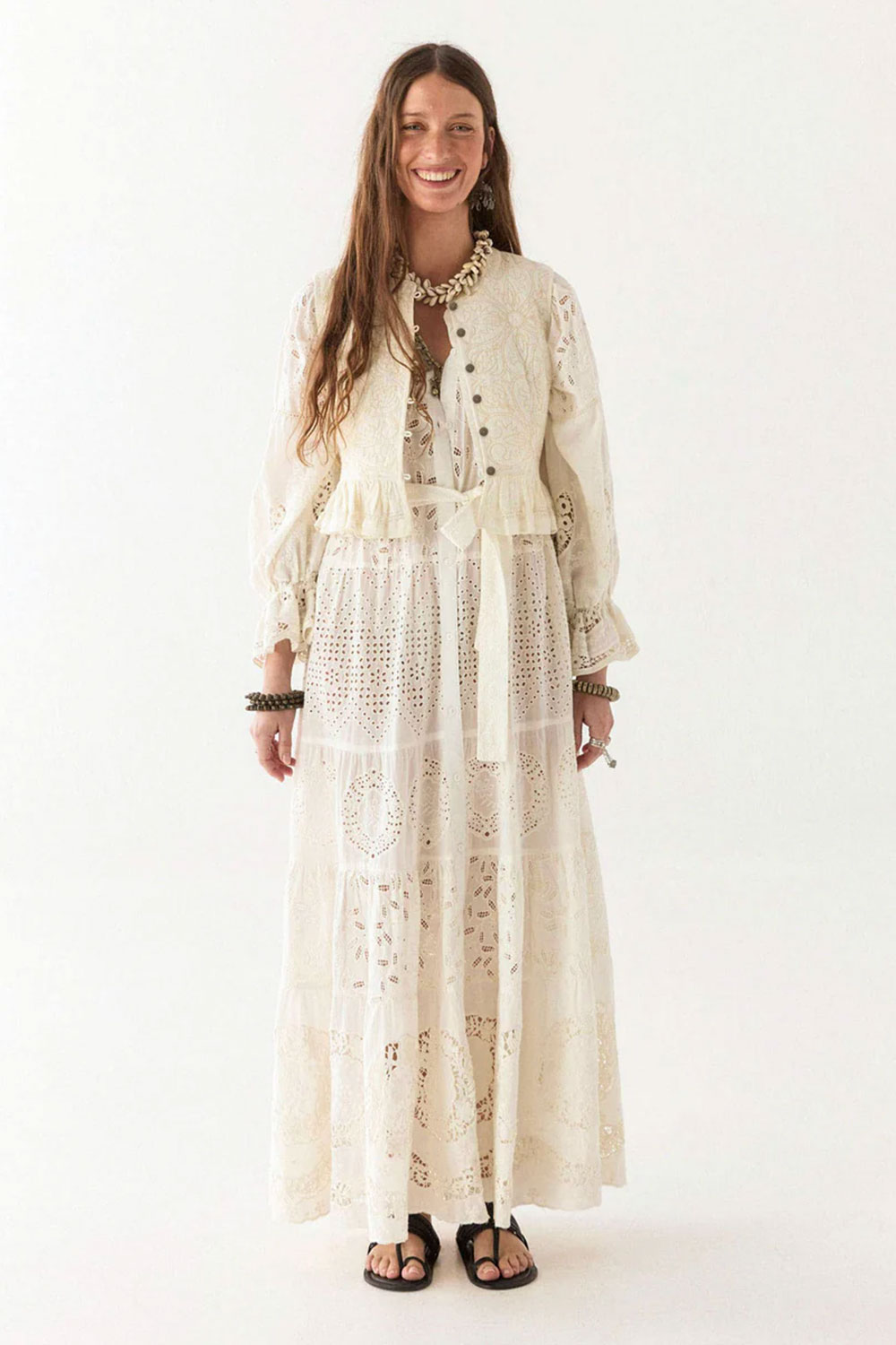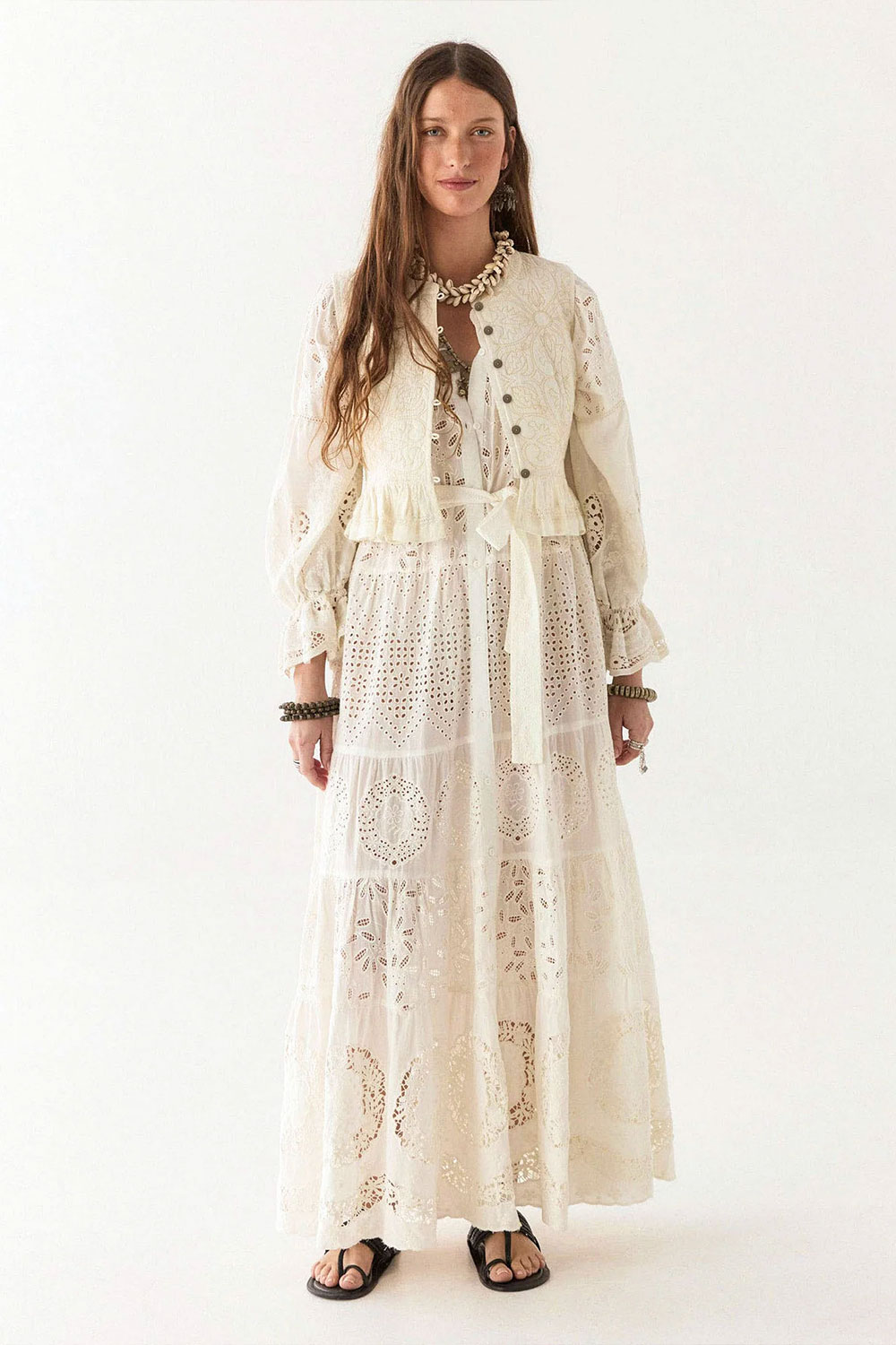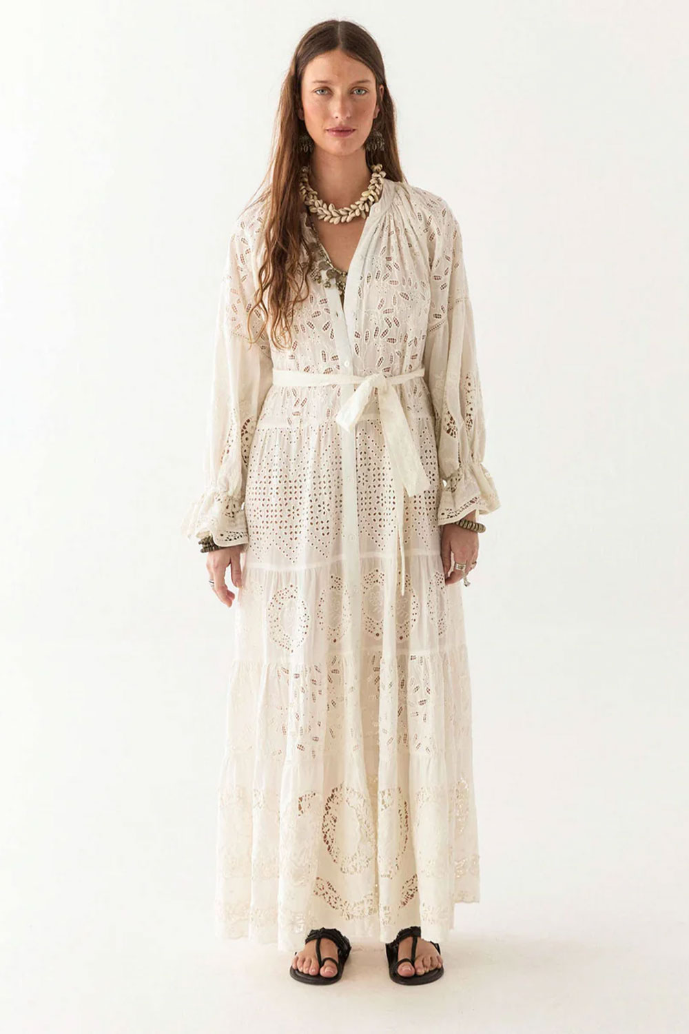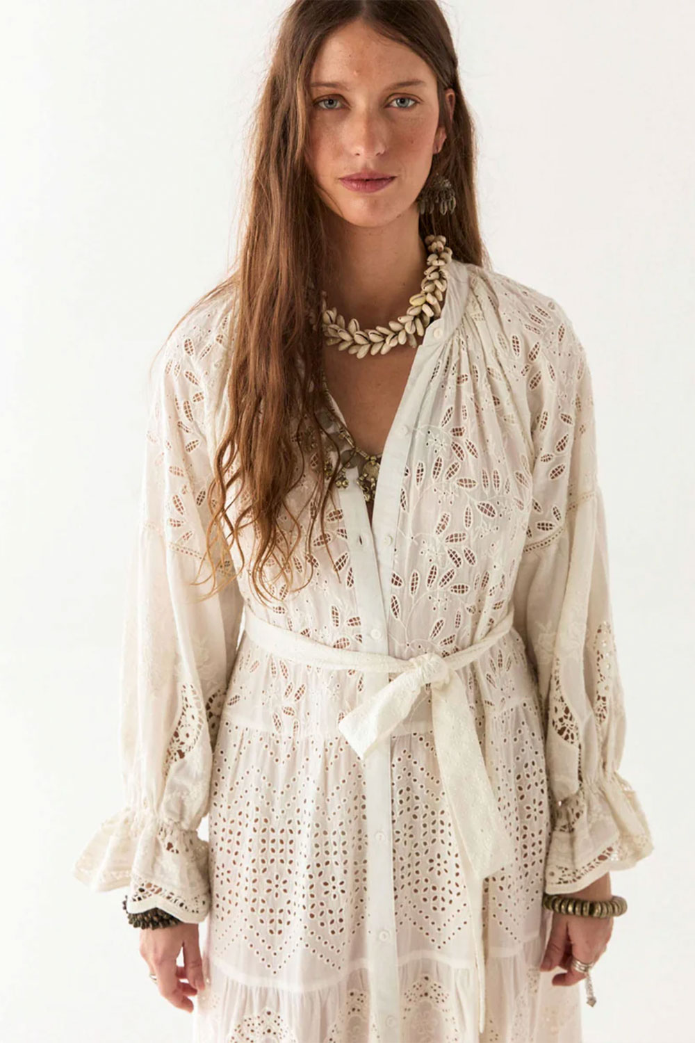 The embroidery is carefully placed to highlight the dress’s fluid structure, while the eyelet cut-outs add depth and texture without overwhelming the design. Subtle pin tucks on the bodice and gathered sleeves enhance the soft volume, giving it a natural drape that moves gracefully. A matching belt cinches the waist for a defined yet relaxed silhouette.