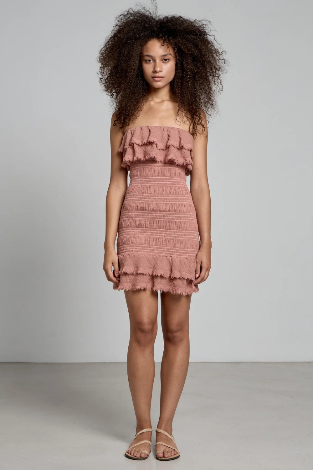 A multi wear piece that can be worn as a mini dress, mini or midi skirt or top. Featuring ruffles and fringed hems.
