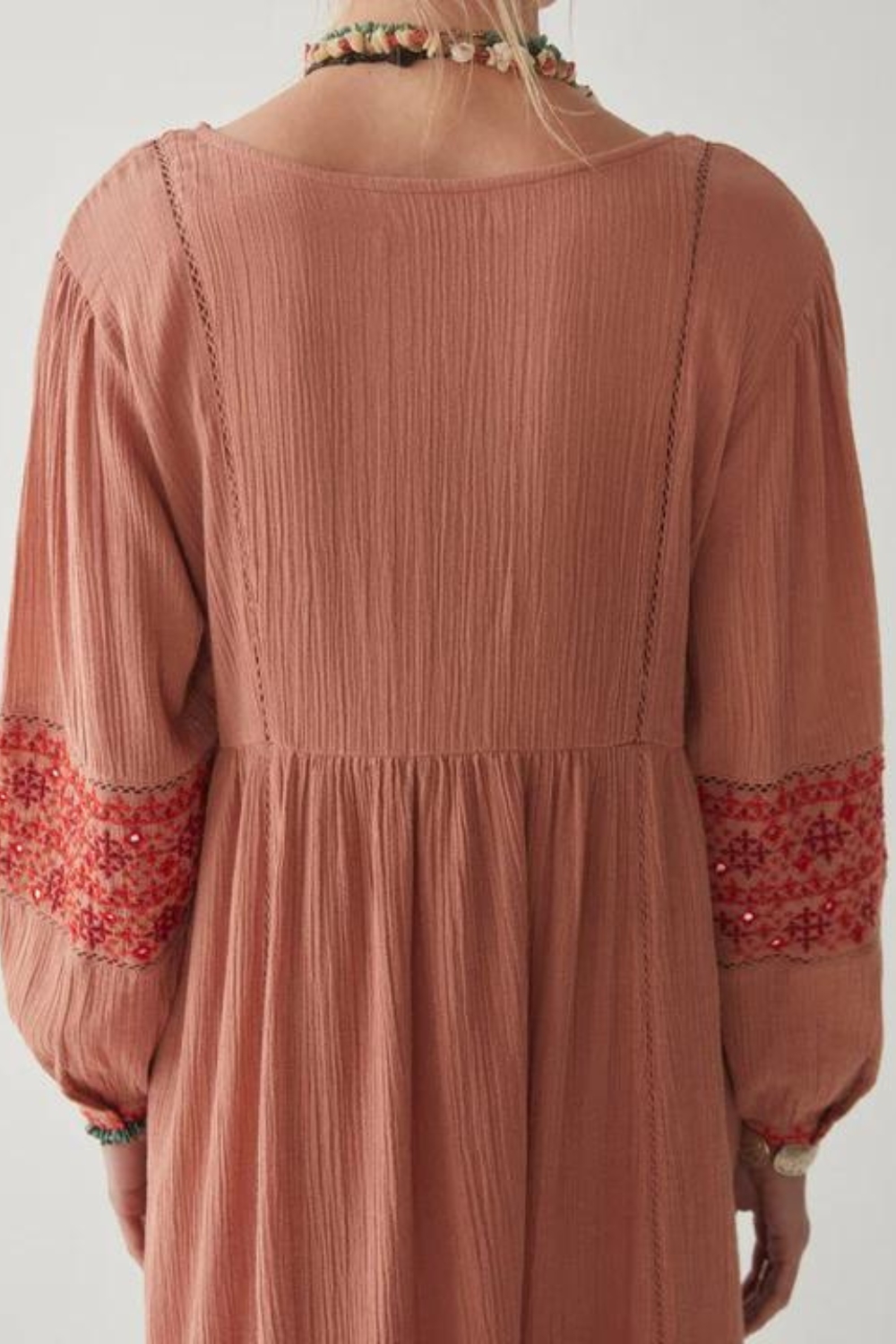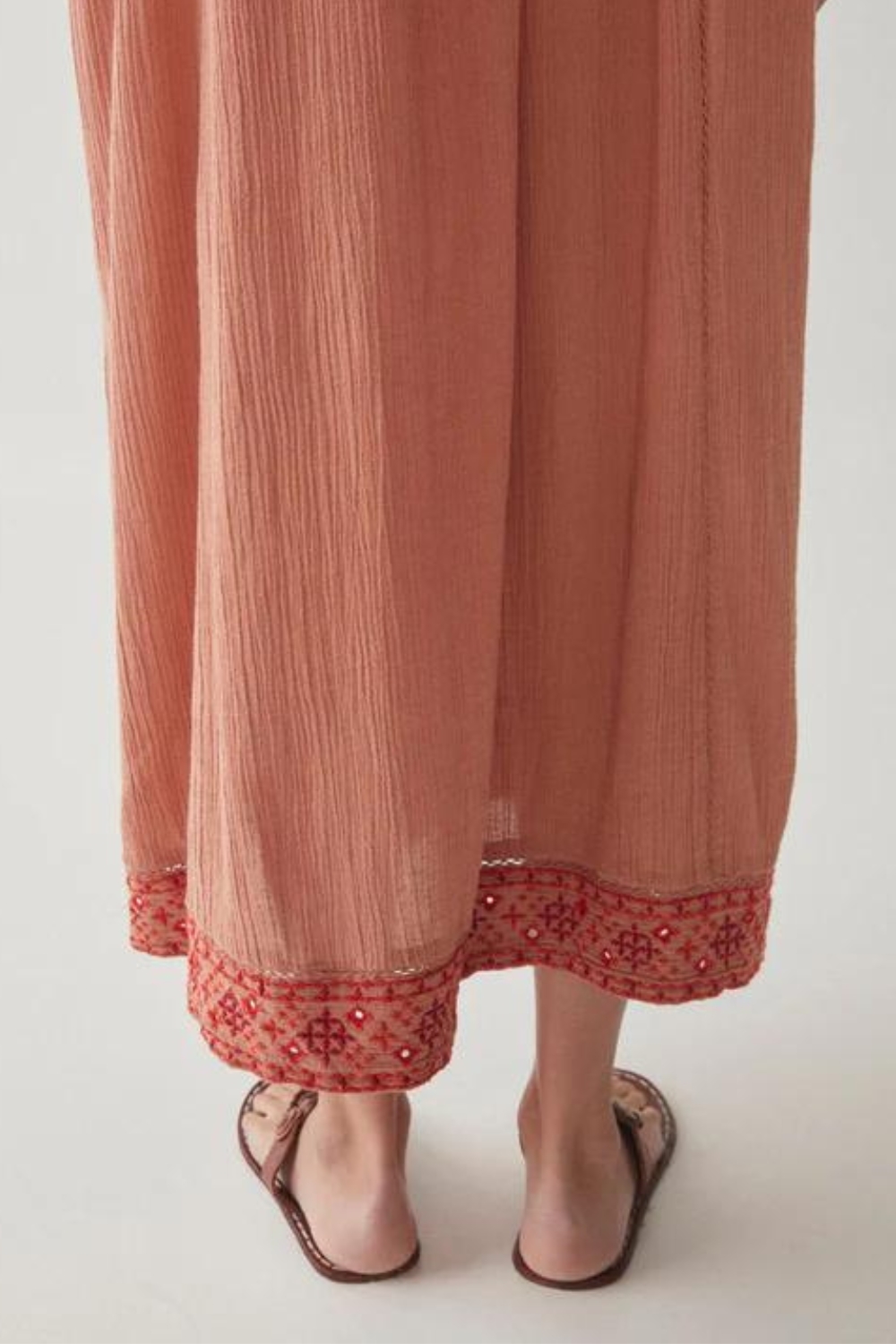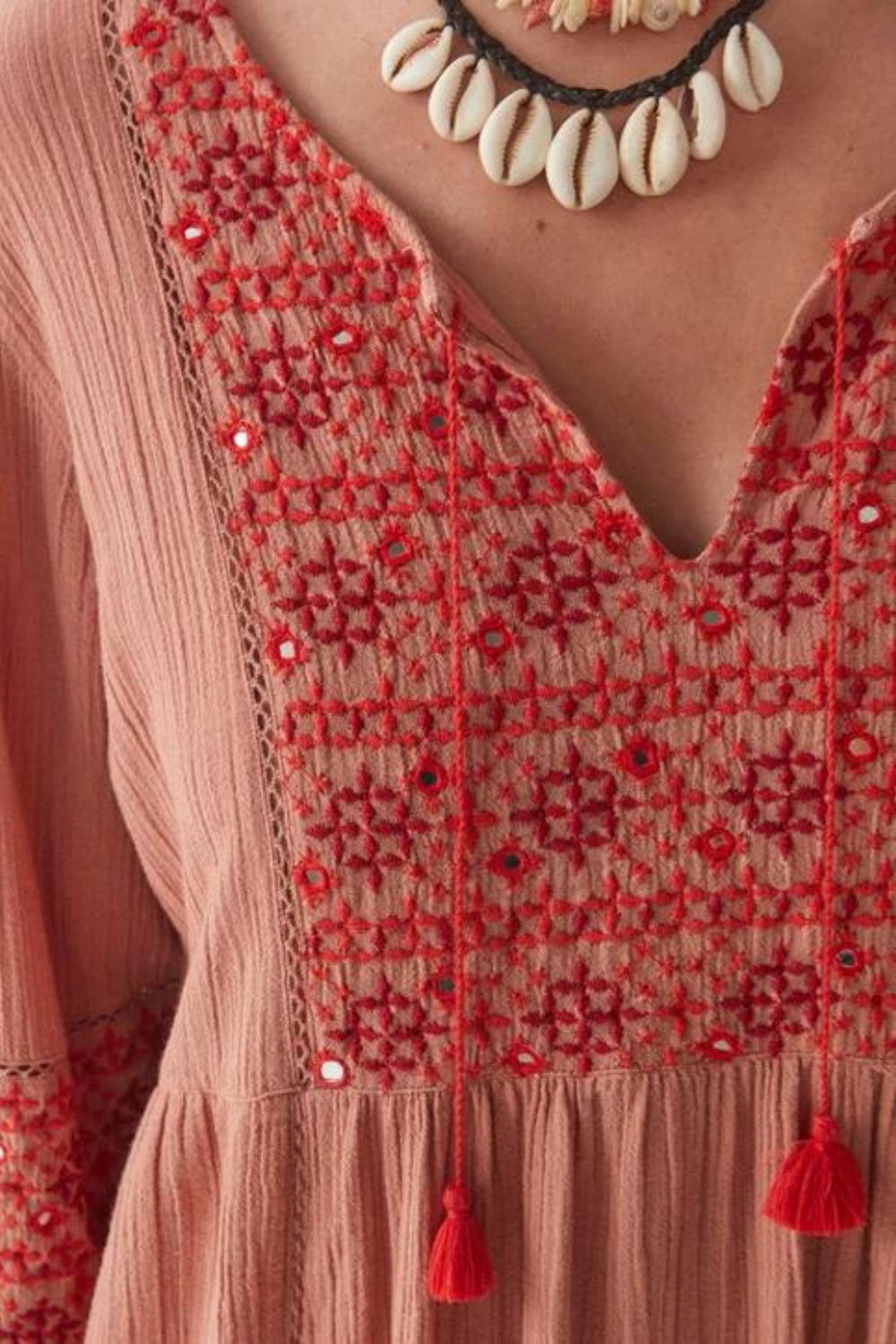 Rendered in a rustic cotton crepe, the midi dress features an intricate motif embroidery across the chest, sleeves and bottom/cuff borders; a small number of mirrors giving it just that touch of shine. Take a closer look and you’ll also find discreet lace inserts.