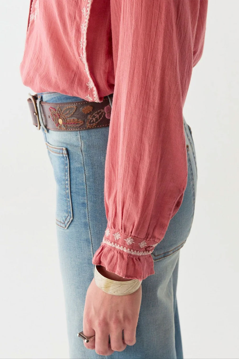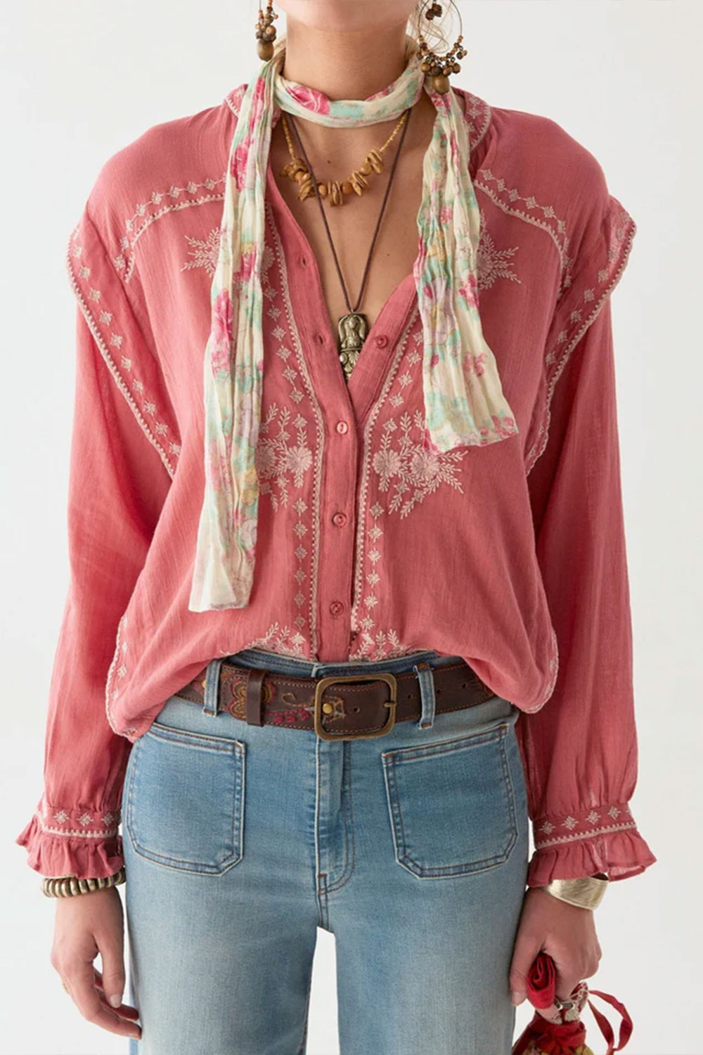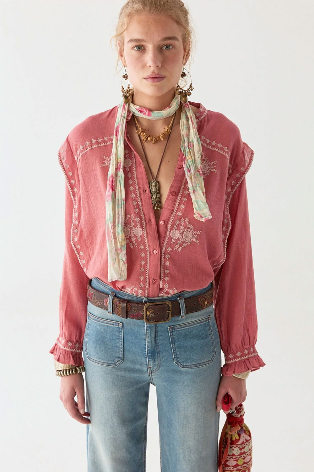 Sun-drenched, dust-kissed, and laced with attitude. Our deep strawberry cotton is rich, bold, and anything but delicate. Embroidery snakes across the fabric—symmetrical, precise, a contradiction of control and chaos.