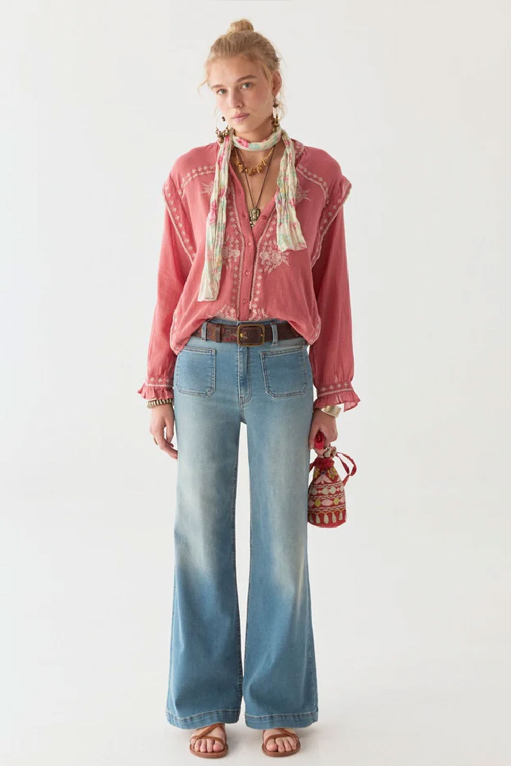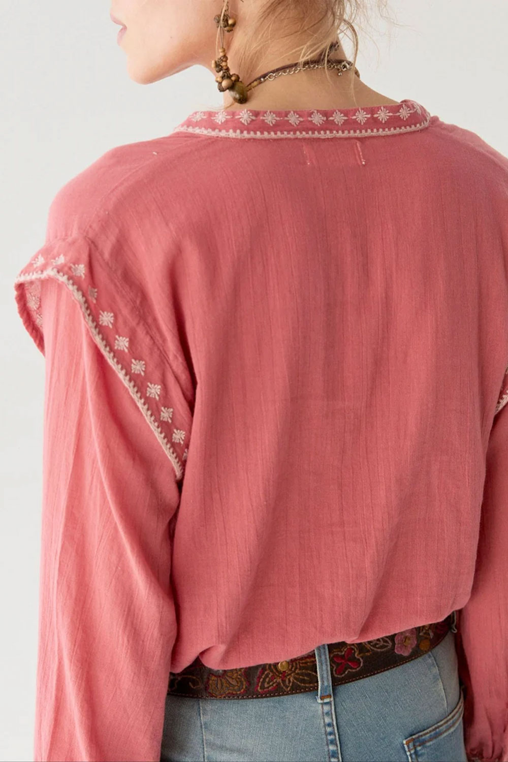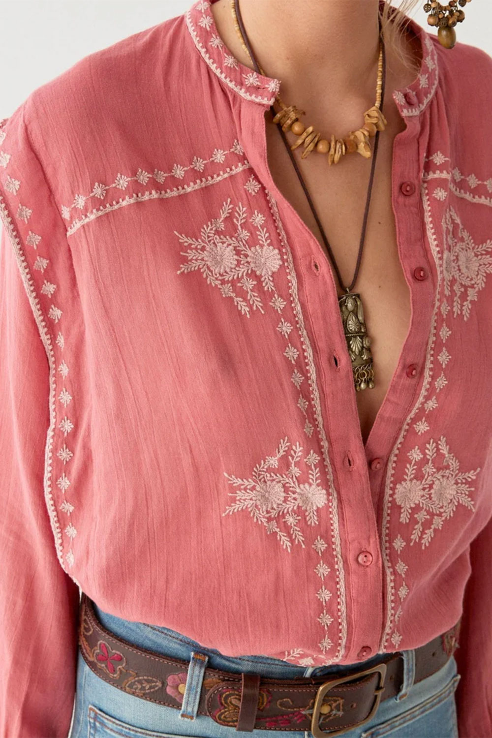 Sun-drenched, dust-kissed, and laced with attitude. Our deep strawberry cotton is rich, bold, and anything but delicate. Embroidery snakes across the fabric—symmetrical, precise, a contradiction of control and chaos.
