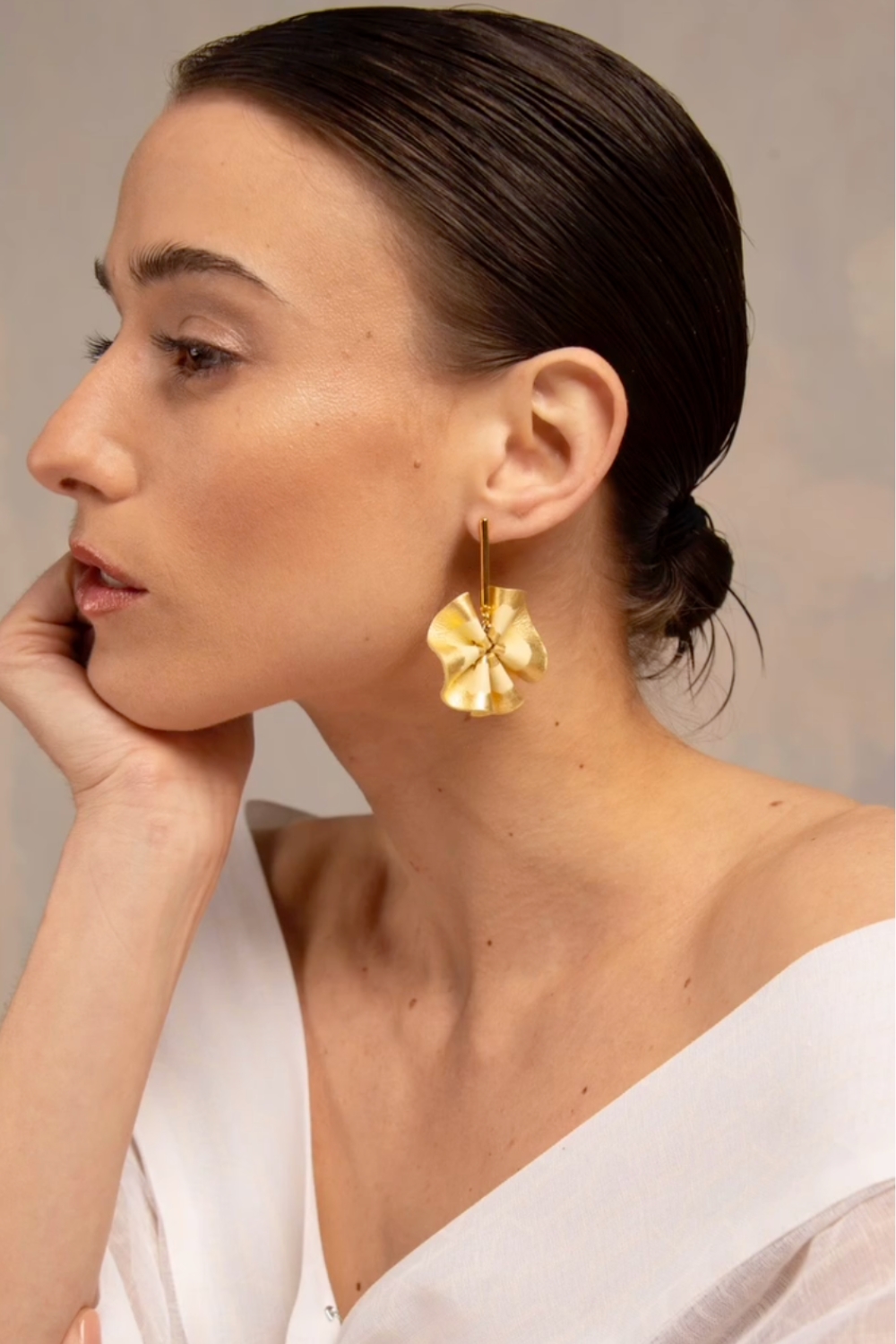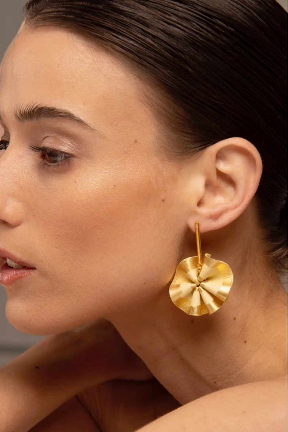 Exuding delicate charm, our Primula Earrings small feature small primula motifs hanging from a sleek metal bar adorned with yellow gold leaf accents. These earrings combine elegance with modernity, adding a touch of sophistication to your look with their understated yet captivating design.