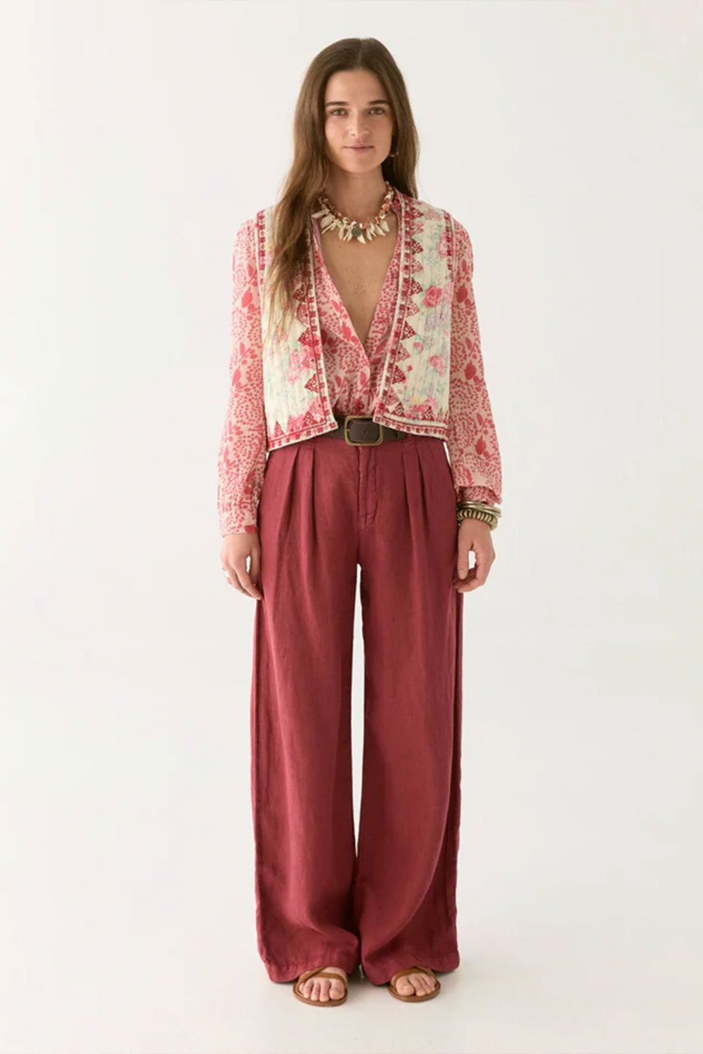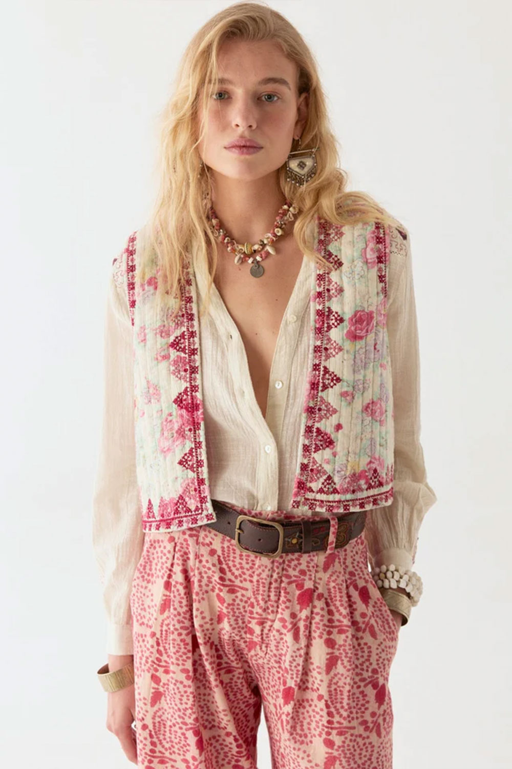 Soft cotton, sharp attitude. The Ramona Vest takes florals and gives them an edge. It’s the perfect clash of sweetness and savagery. Drenched in candy-rose blooms and framed by crimson geometric embroidery, this piece plays with contrast—soft meets sharp, pretty meets provocative.