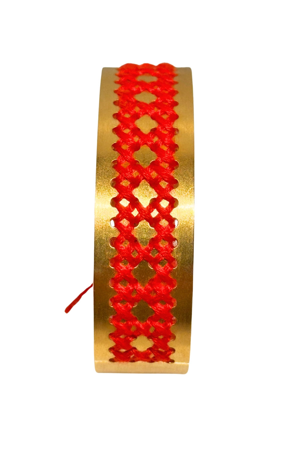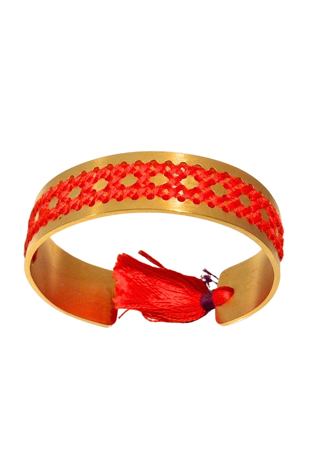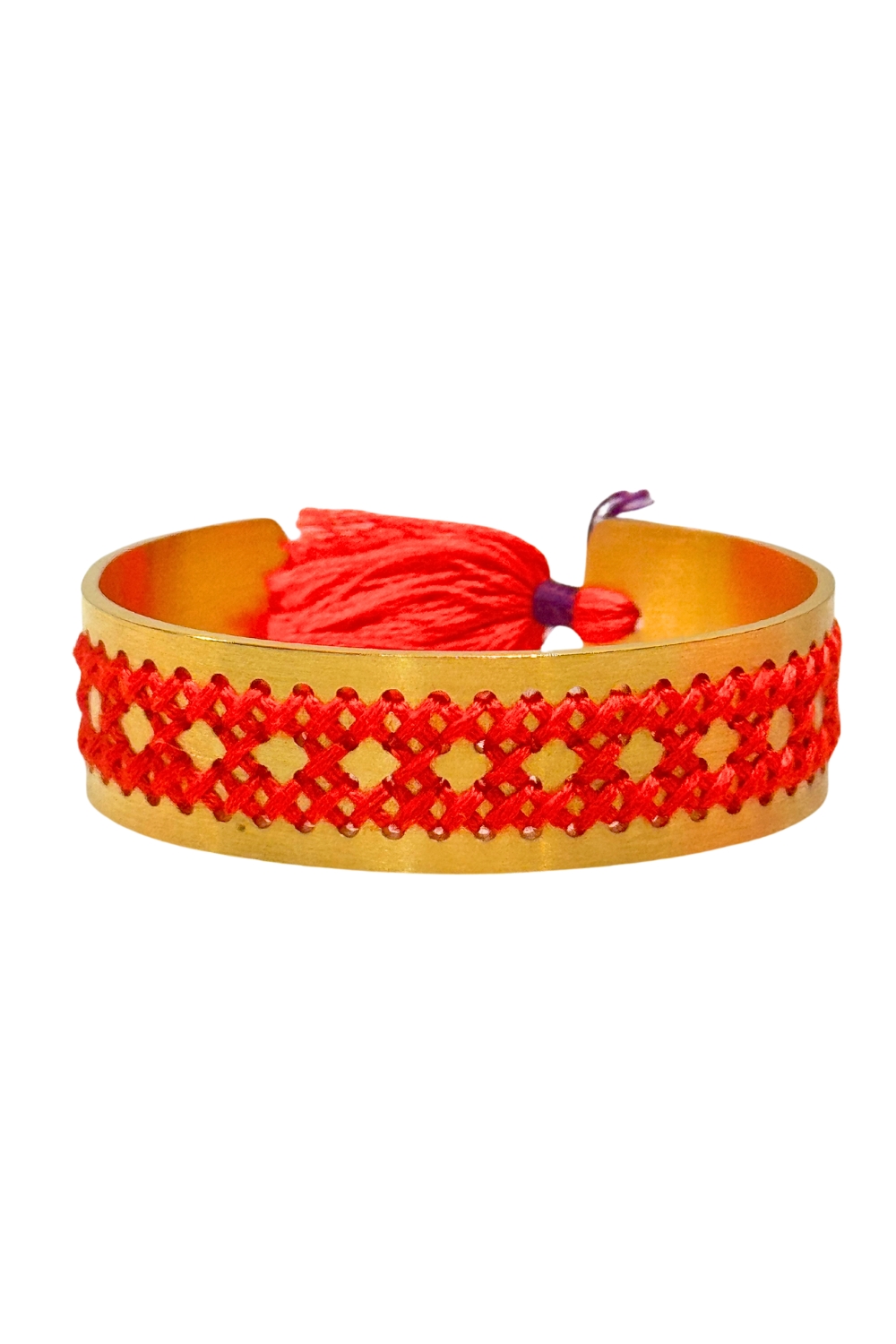 Gold plated recycled brass with anti-tarnish finishing. Open bracelets are semi-adjustable, bend them gently to fit the size of your wrist. Each item is unique and hand stitched by hand with cotton DMC embroidery floss.