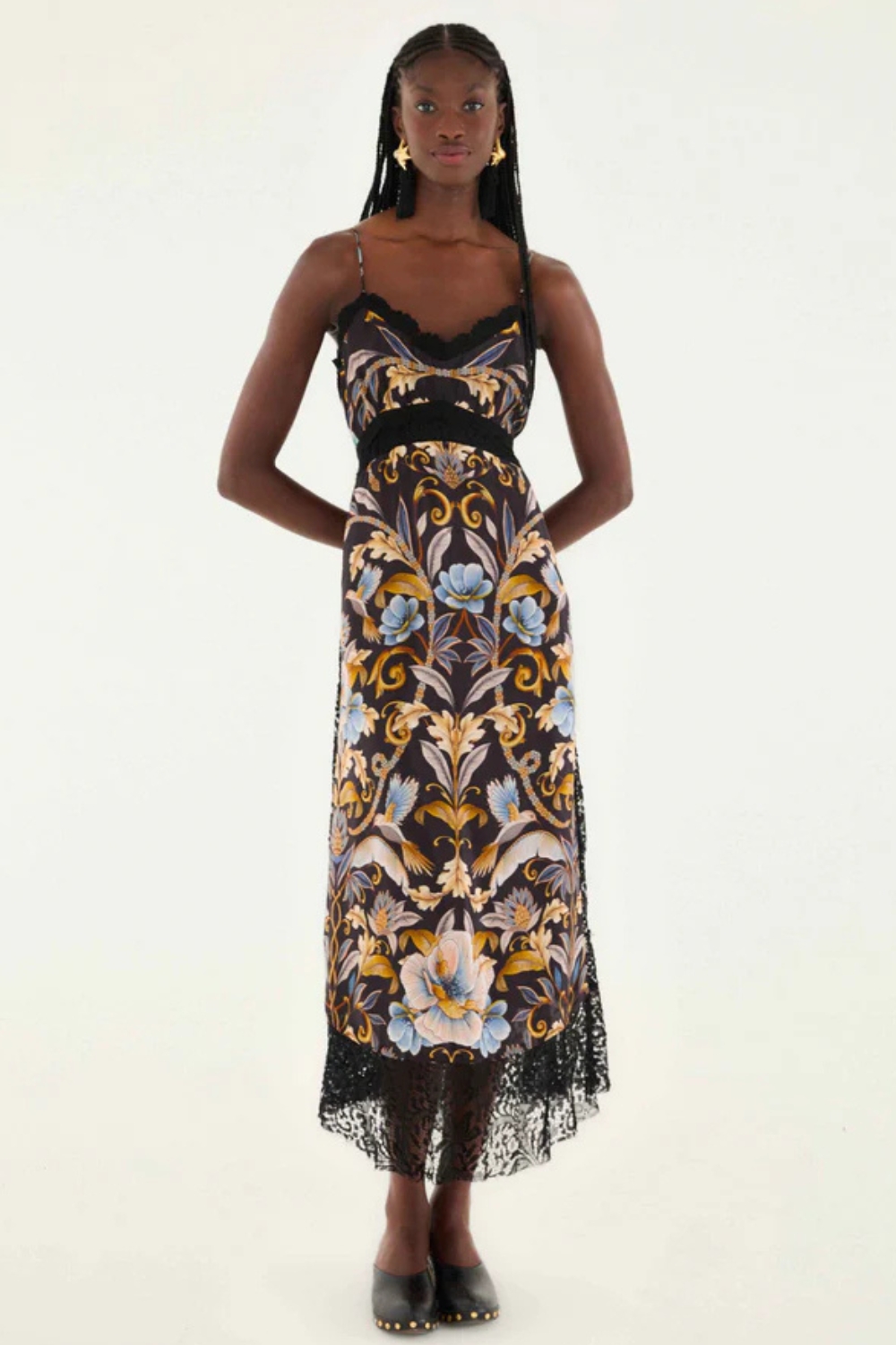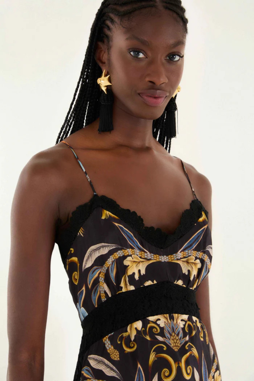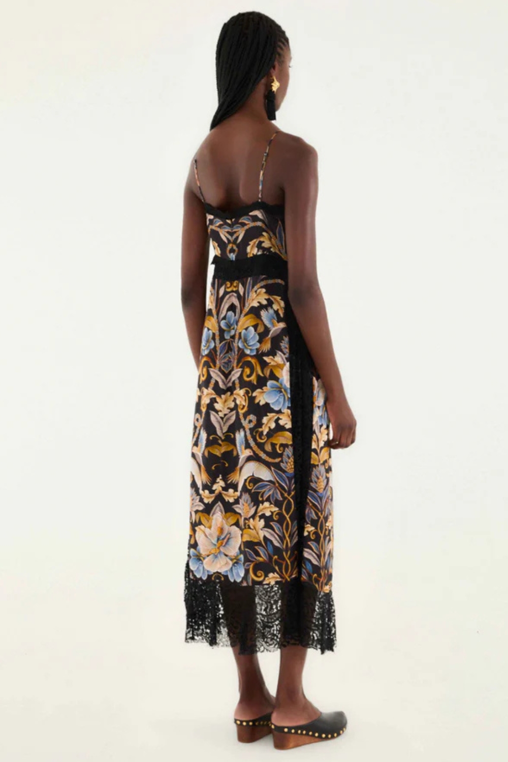 The Snake Garden Black Midi Dress brings playful elegance with its V-neck and zipper closure at the back for easy wear. Sleeveless with adjustable straps, it ensures a comfortable, customizable fit. Intricate lace insets at the neck, waist, sides, and hem add a flirty, feminine touch that makes this dress perfect for dancing the night away or turning everyday moments into something special.