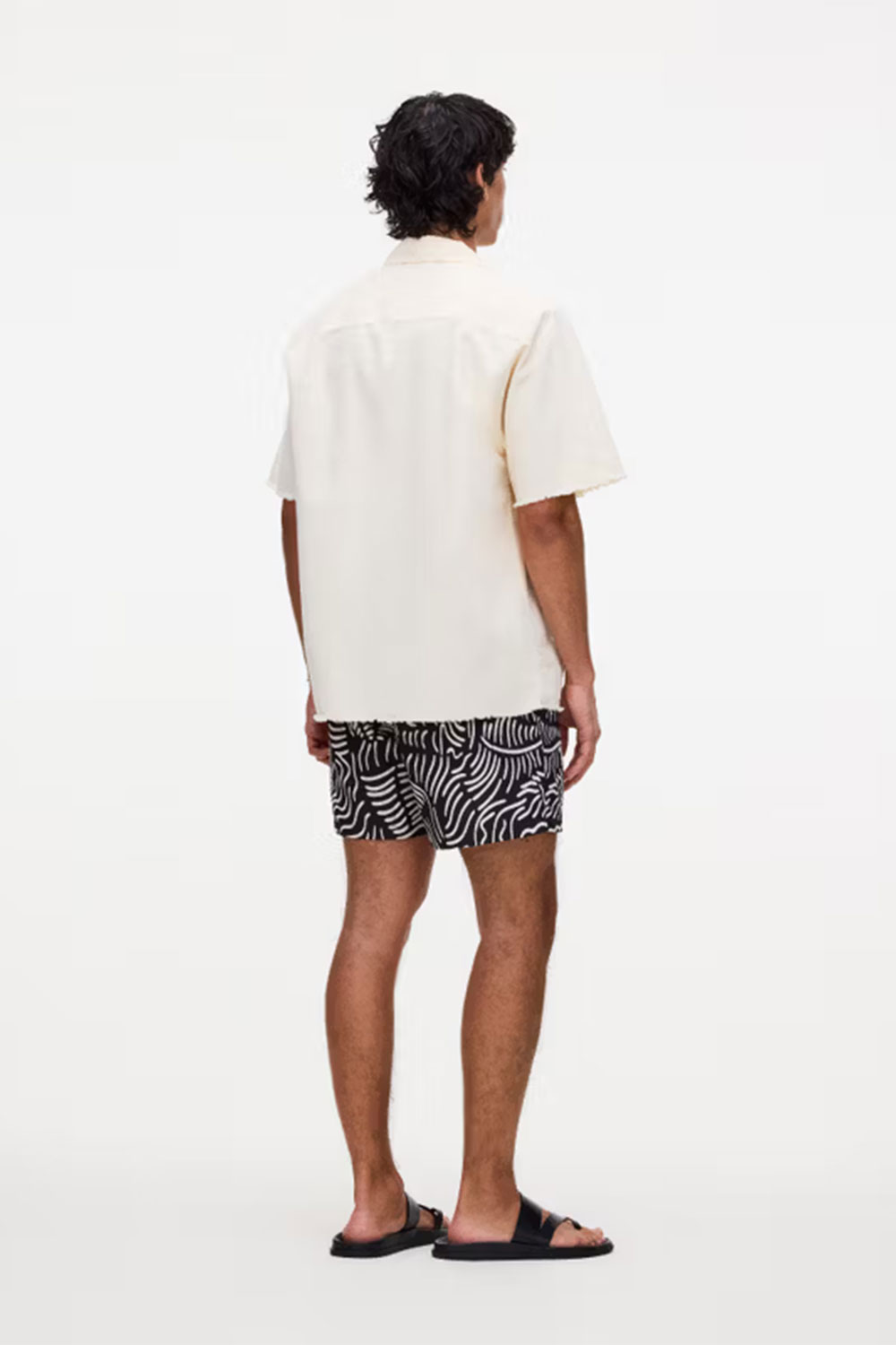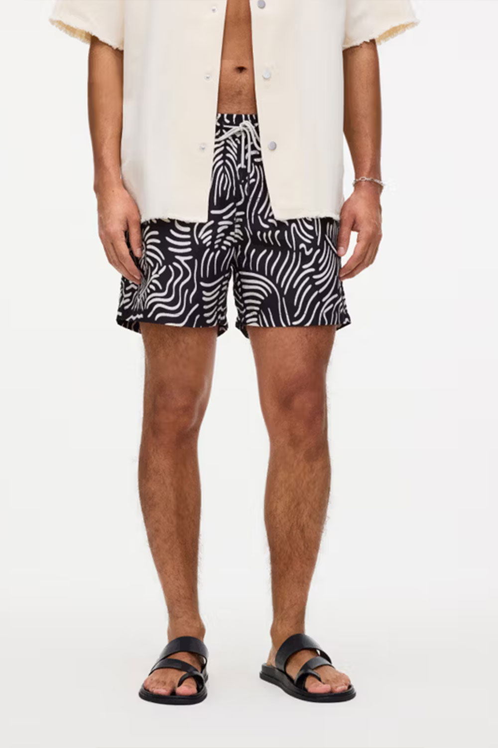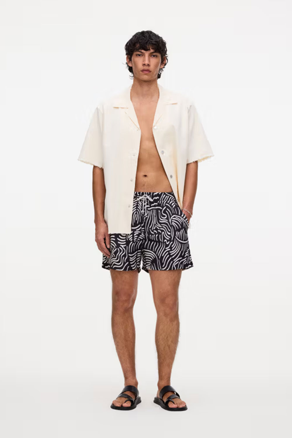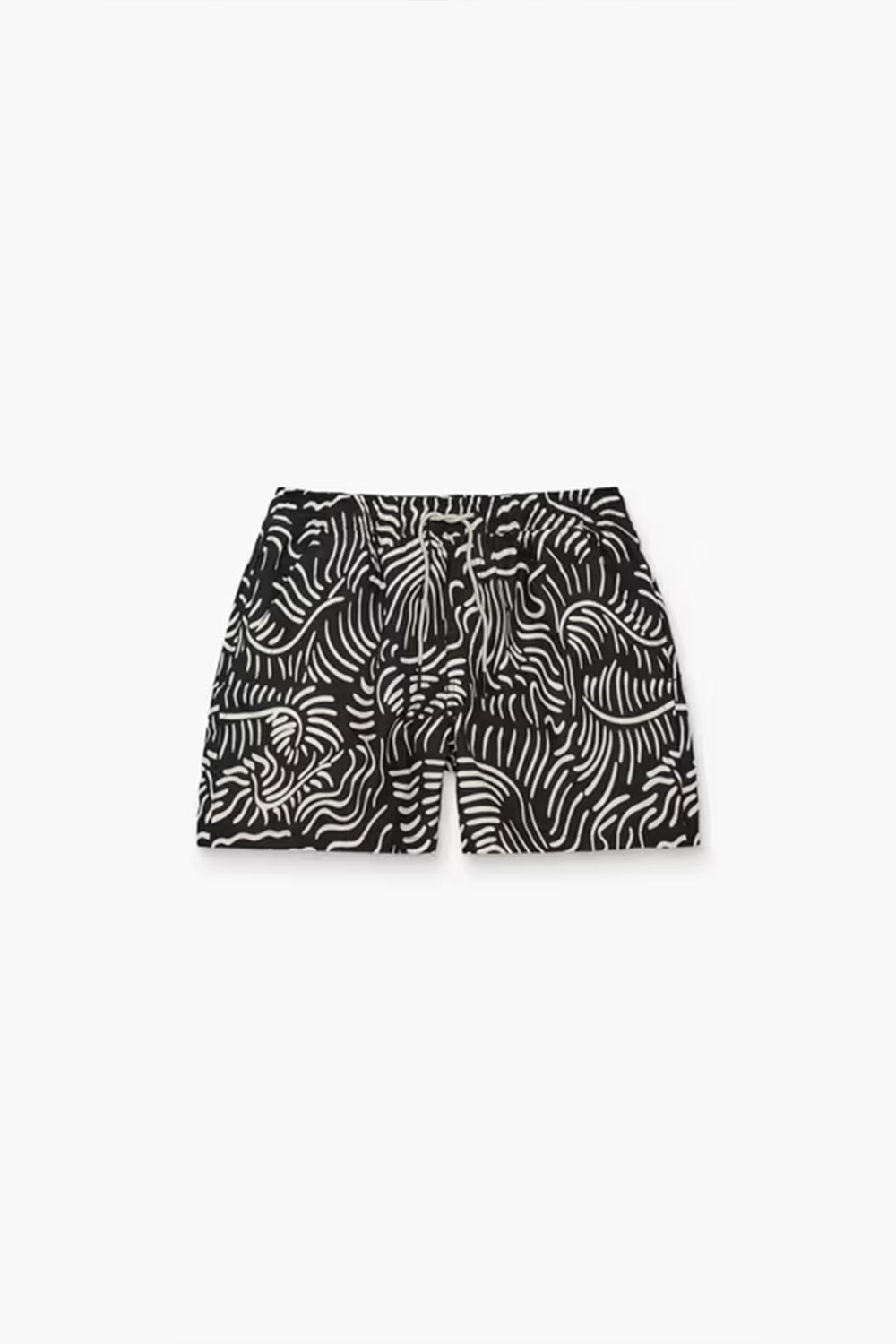 The Tar Lorenzo swim shorts are tailored from a brushed, quick-drying shell fabric, printed all over with botanical freehand strokes. Cut for a relaxed, straight fit with an elasticized drawstring waistband and built-in mesh briefs for comfort and support. Keep your keys and cards securely stored in the hidden zip pocket.