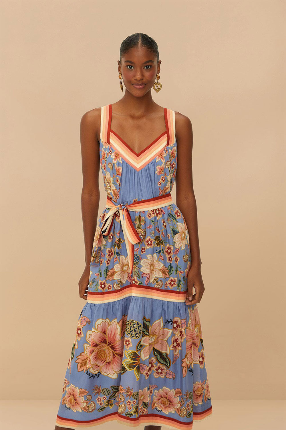 Step into whimsical elegance with the Blue Superbloom Tapestry Maxi Dress from FARM Rio. This captivating piece features a vibrant tapestry of floral patterns and delightful hues of blue, creating a garden-inspired masterpiece. Its flowing silhouette enhances every movement, while the playful V neckline adds a touch of grace. Perfect for capturing the spirit of Brazilian summer nights, this dress radiates warmth and personality in every detail.
