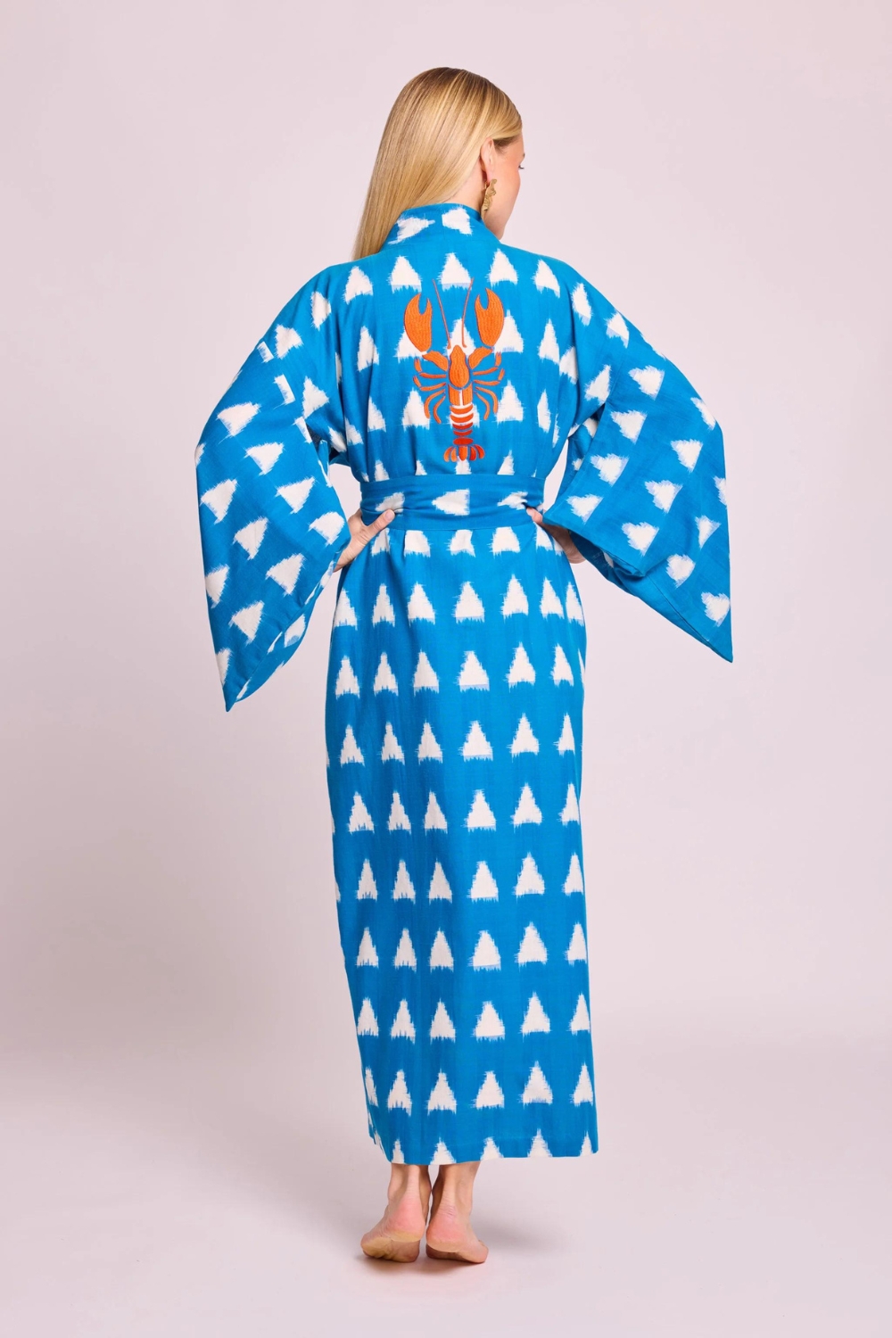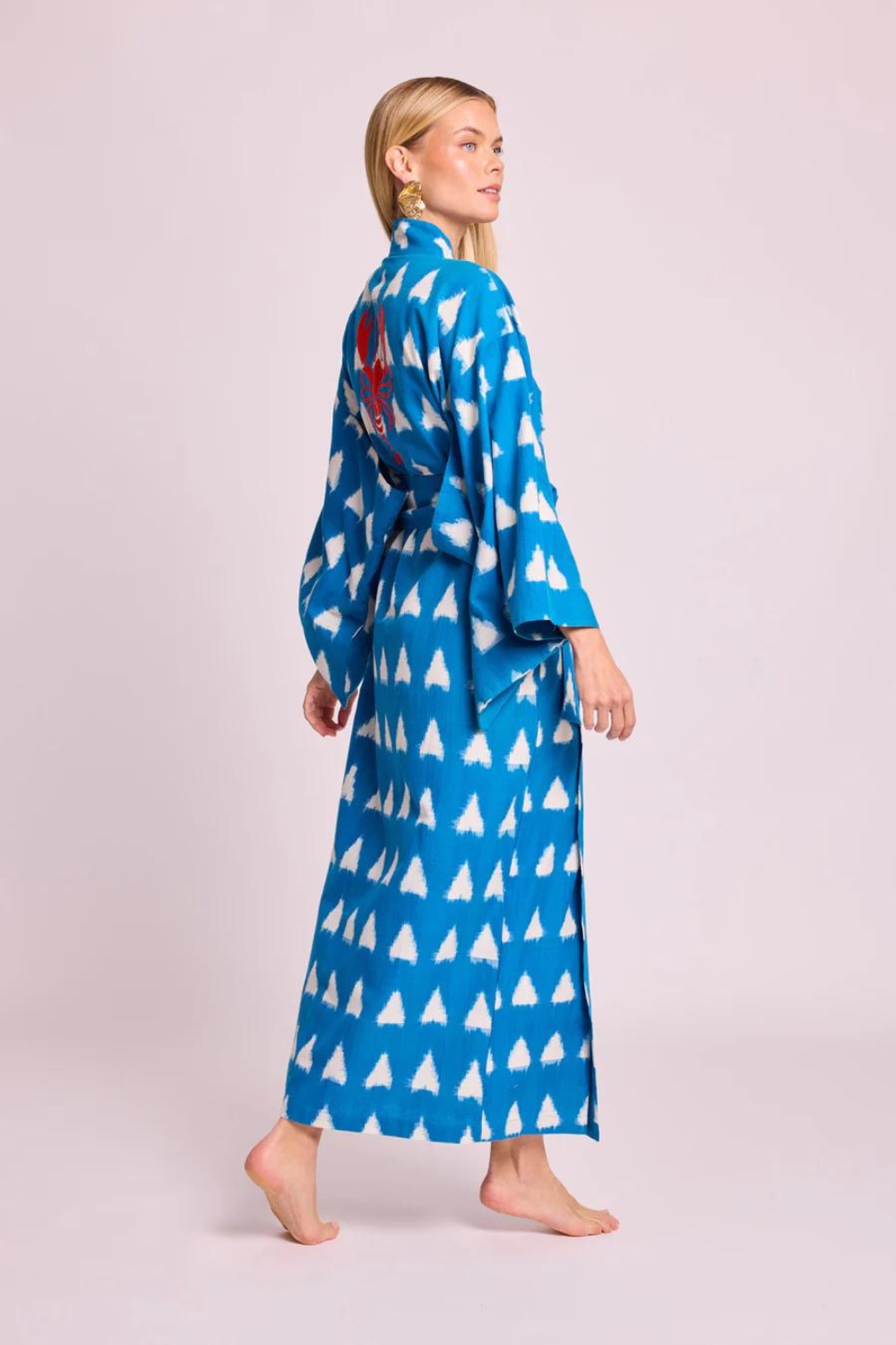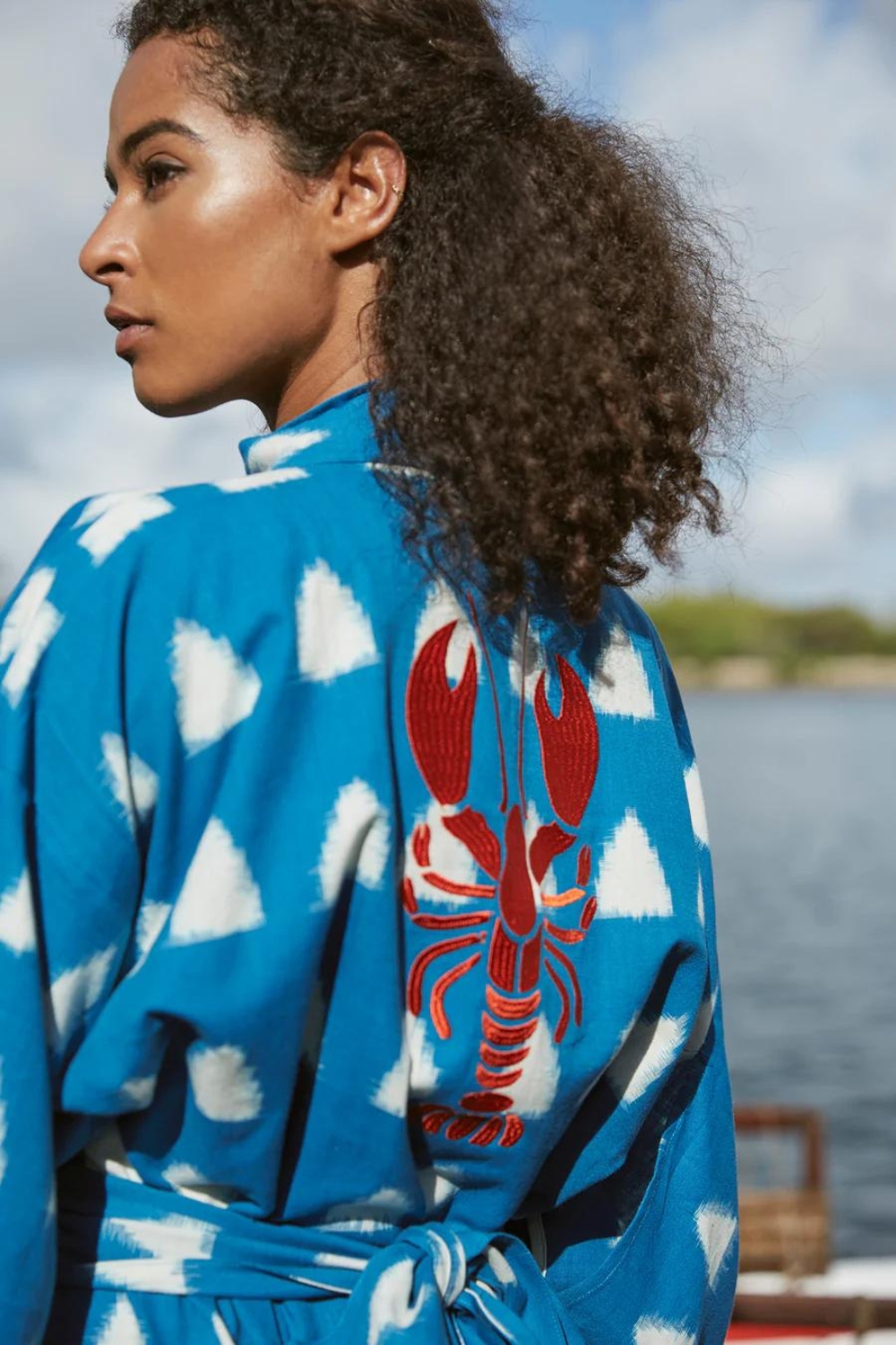 The Turquoise Kimono from KLEED is a vibrant and stylish piece designed to evoke the essence of summer, sunshine, and the warm waters of the Mediterranean Sea. The stacked white cones pattern adds a satisfying geometrical touch, while the scarlet lobster embroidered on the back brings a blaze of welcome color.
