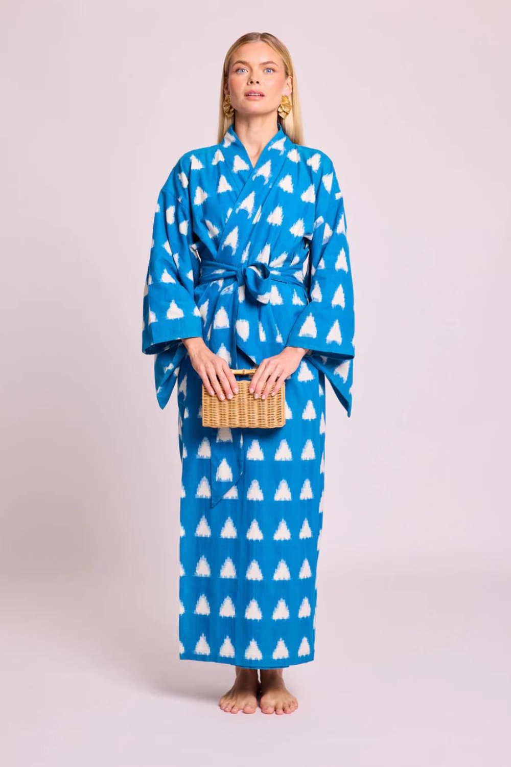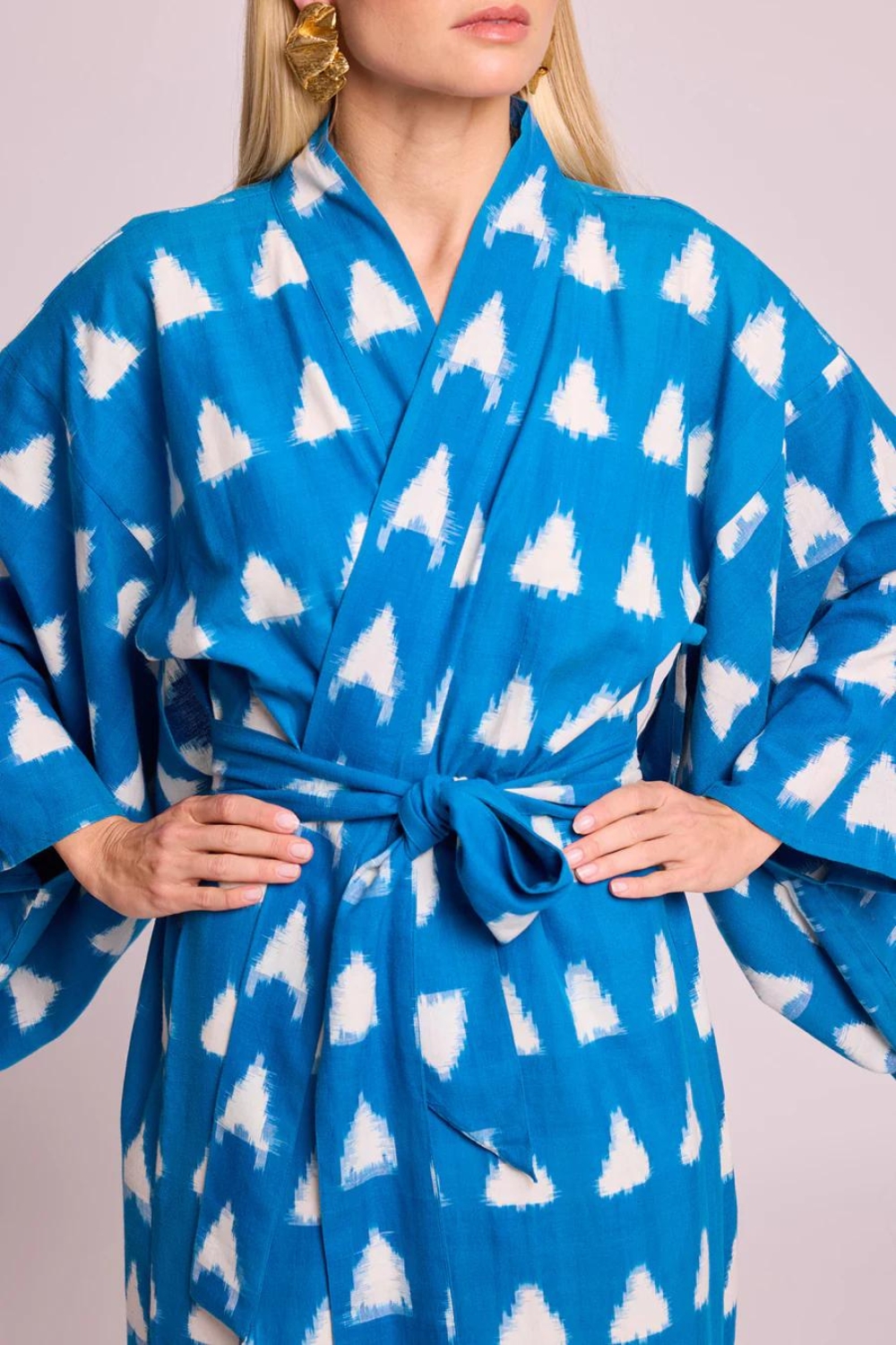 This kimono is part of KLEED’s collection of double IKAT kimonos, handcrafted using age-old techniques to create a shaded-pattern effect. The double-breasted kimono collar and detachable, flattering wide belt add to its stylish and versatile design.