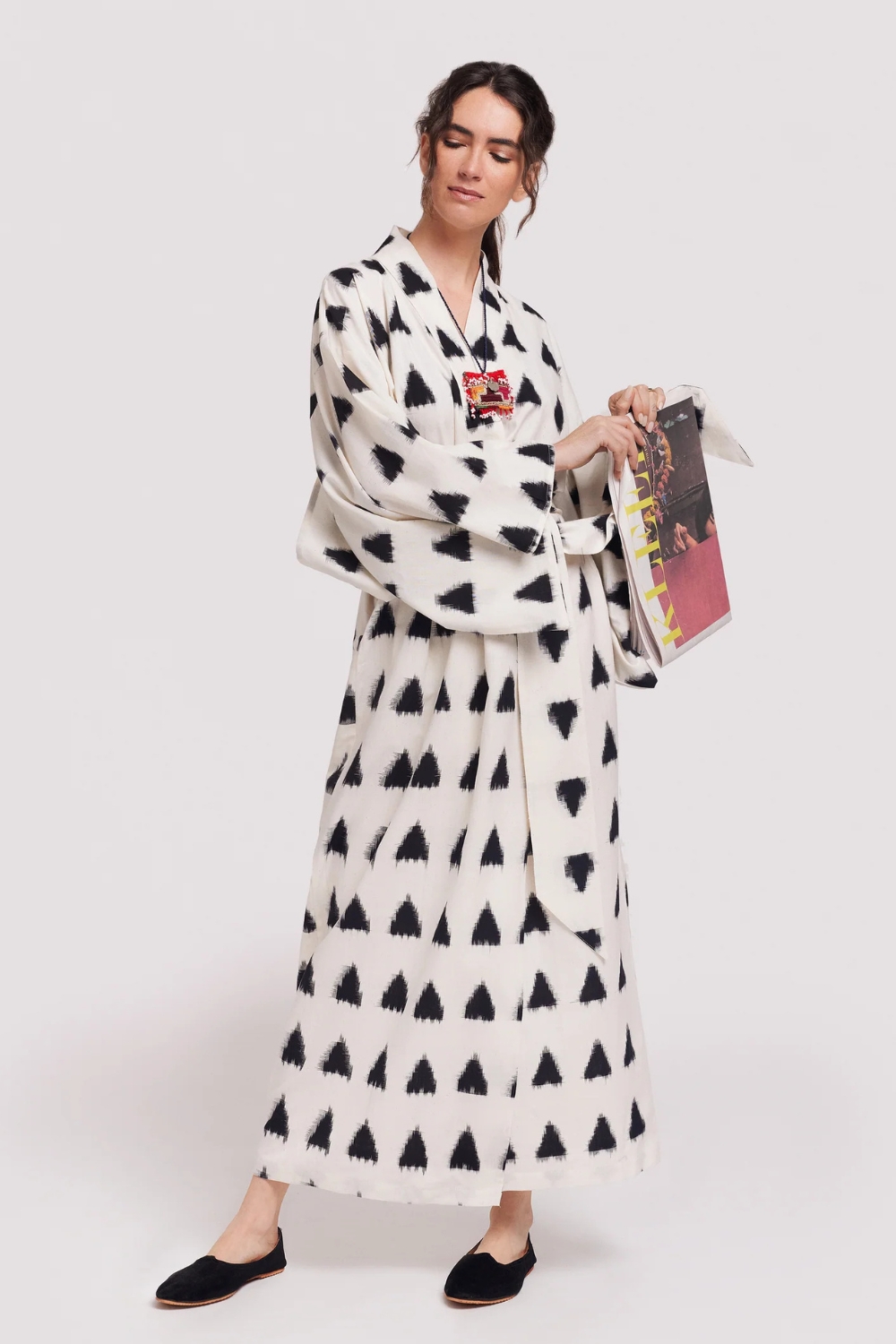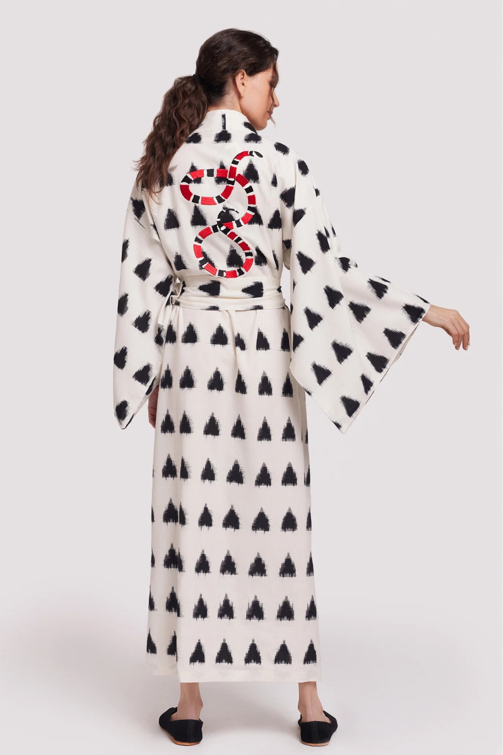 Discover KLEED’s best-selling White Savannah Kimono, a true work of art in sustainable luxury. Handcrafted from 100% pure cotton using traditional IKAT techniques, this striking black and white kimono features a bold pattern and a dramatic cobra embroidery in red, black, and white on the back, with a double-breasted collar and detachable wide belt. Each piece is skillfully hand-loomed by artisans, supporting slow fashion, ancestral craftsmanship, and small communities.